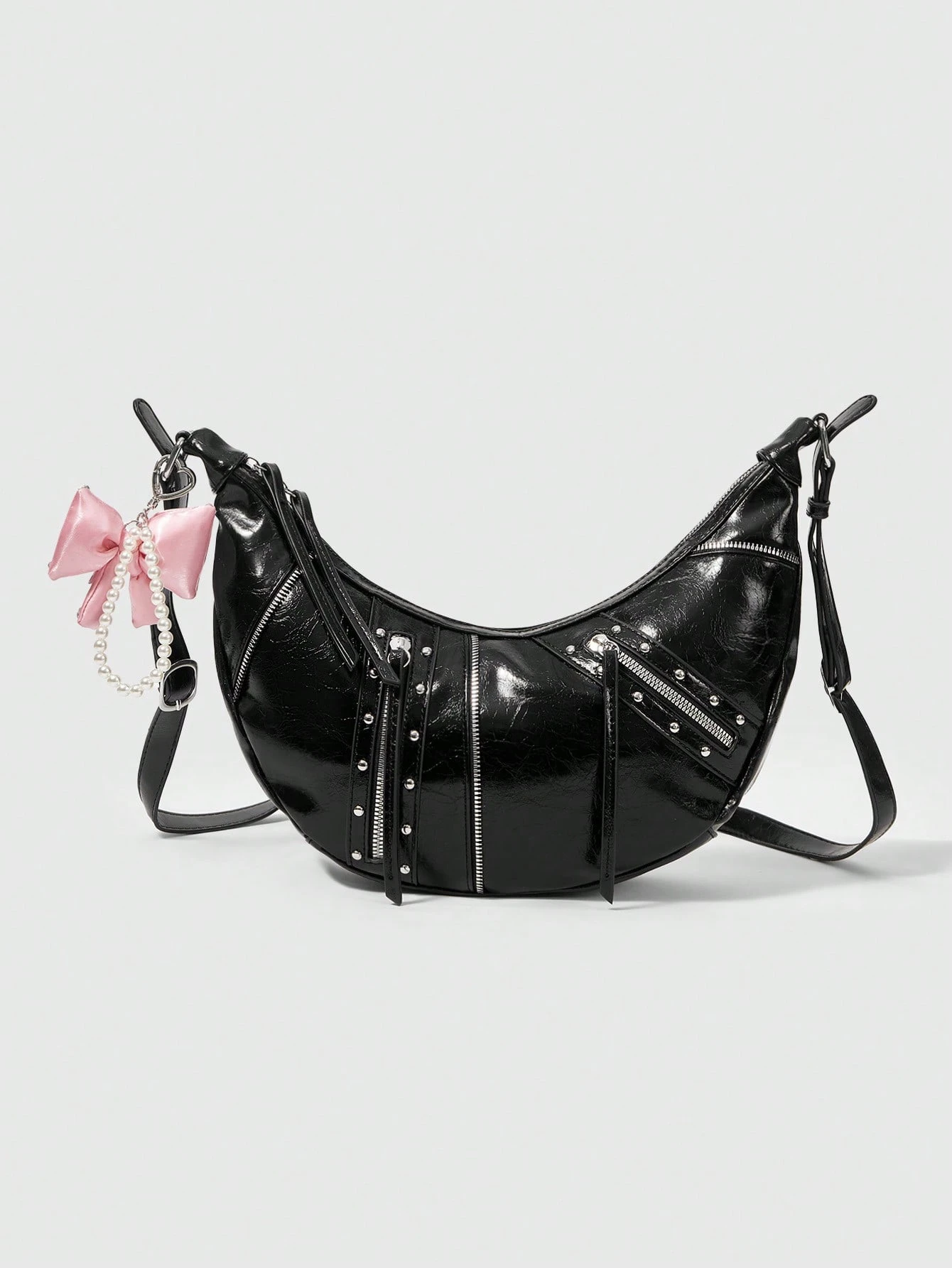 Grunge Punk Mode Nieten Halbmond PU Schultertasche für Frauen