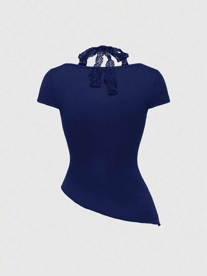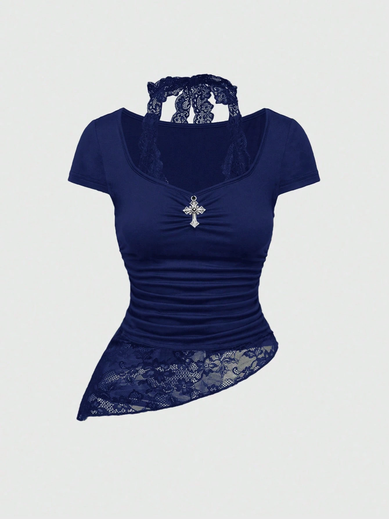 Grunge Punk Gothic Kreuz Anhänger Spitze Patchwork Stehkragen Figurbetontes Damen T-Shirt