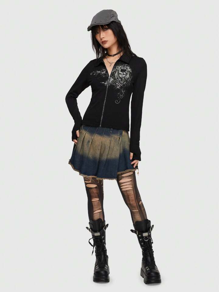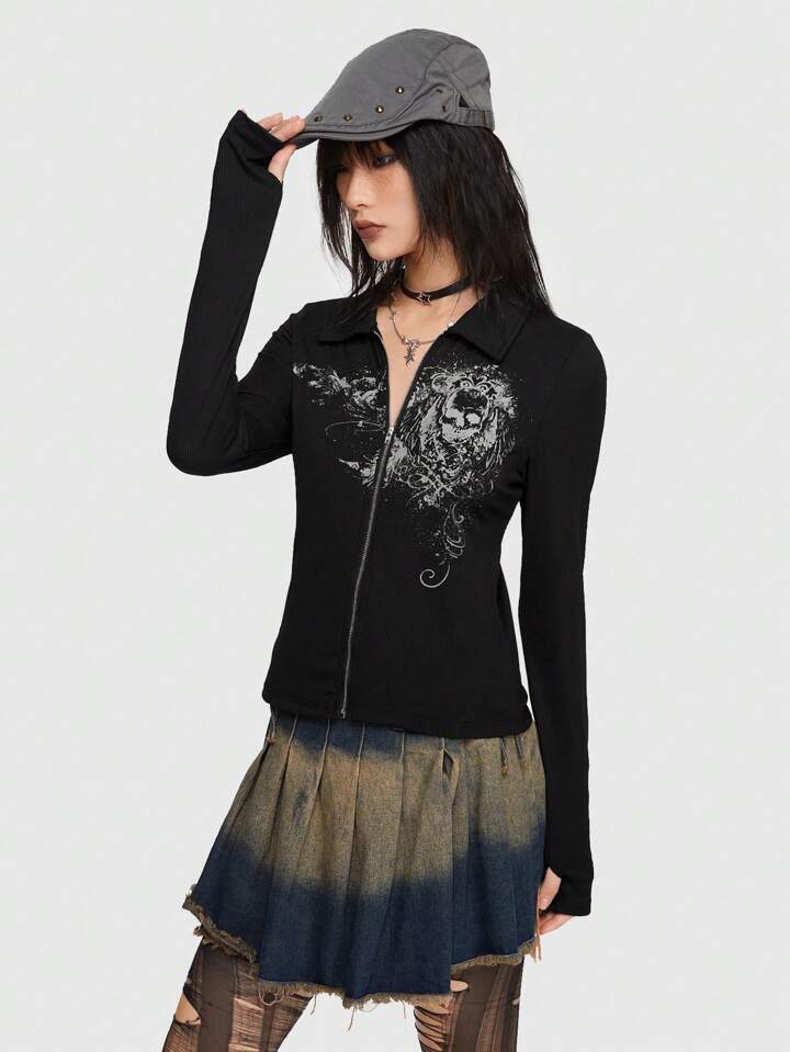Grunge Punk Grafischer Muster Reißverschluss Sweatshirt, Schule