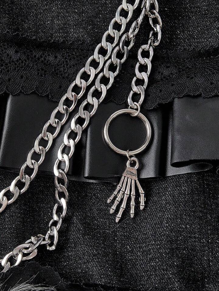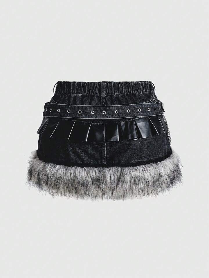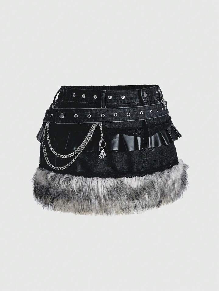 Grunge Punk Grunge-Punk Y2K Vintage Patchwork Kunstpelz PU Metall Spinnen Schädel Anhänger Super Kurzer Jeans Mini Rock, Große Größen Kpop Jeans Rock