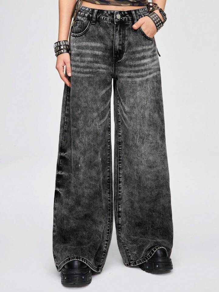 Grunge Punk Frauen Boyfriend-Jeans im Vintage-Grunge-Stil mit weitem Bein und Schneewaschung, Streetwear, Schule