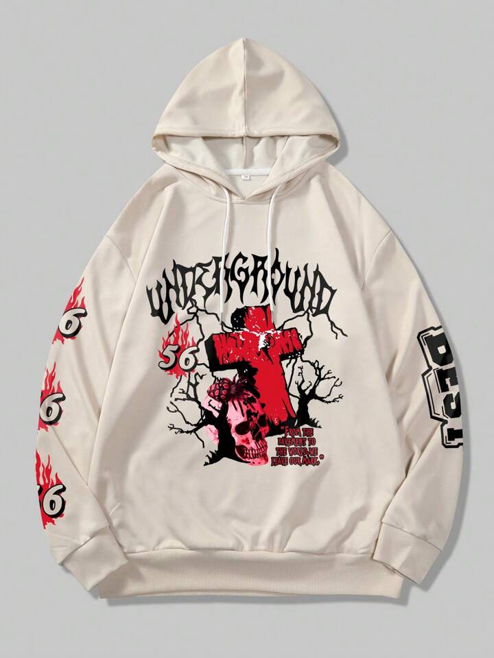 Grunge Punk Männer Hoodie mit Buchstabe & Cartoon Grafik, Tunnelzug,