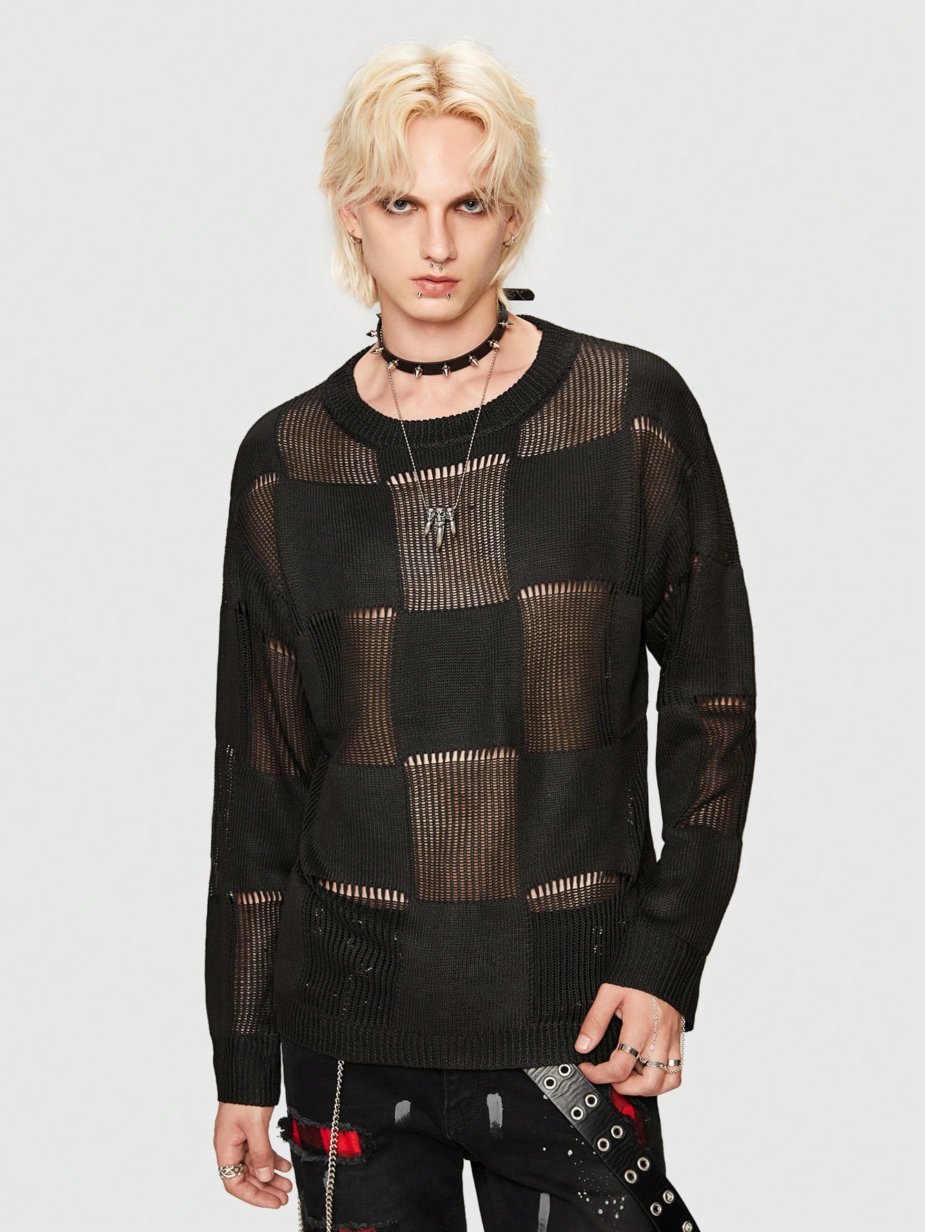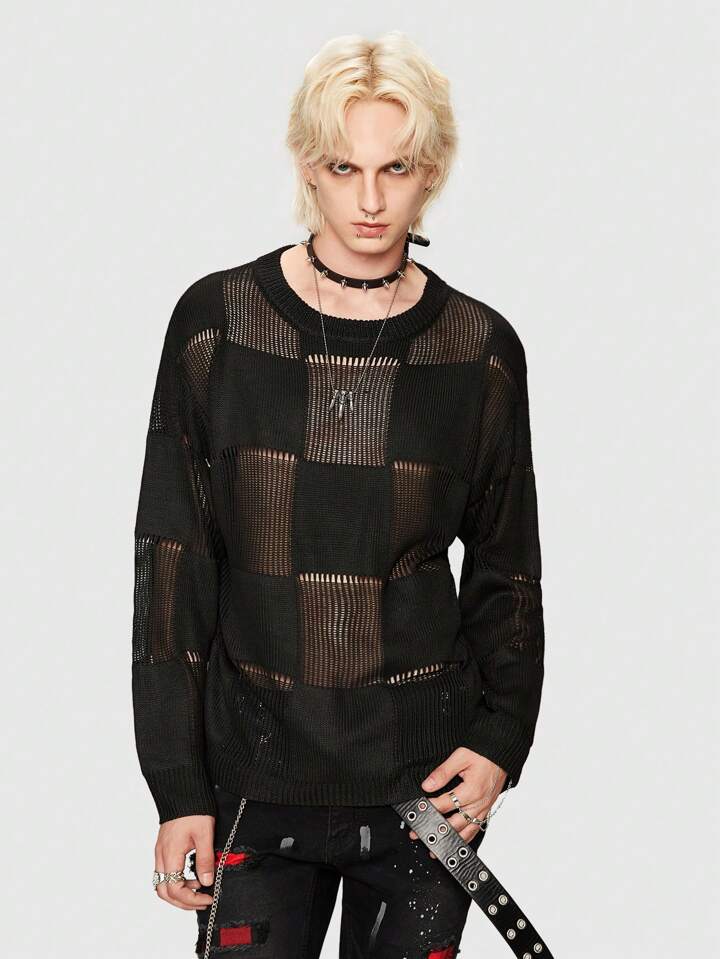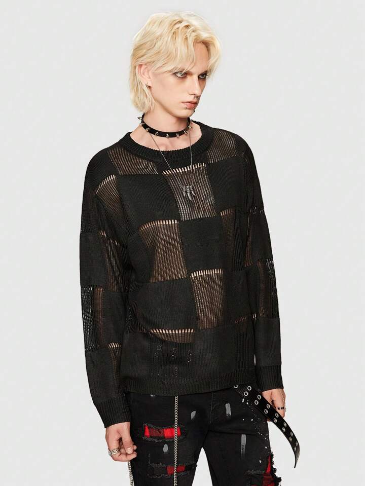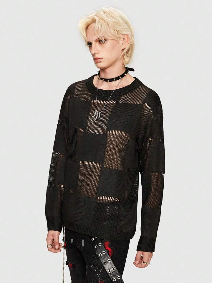 Grunge Punk Männer Pullover mit Einfarbig Loch,