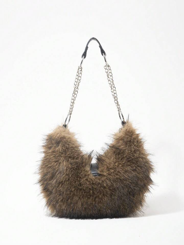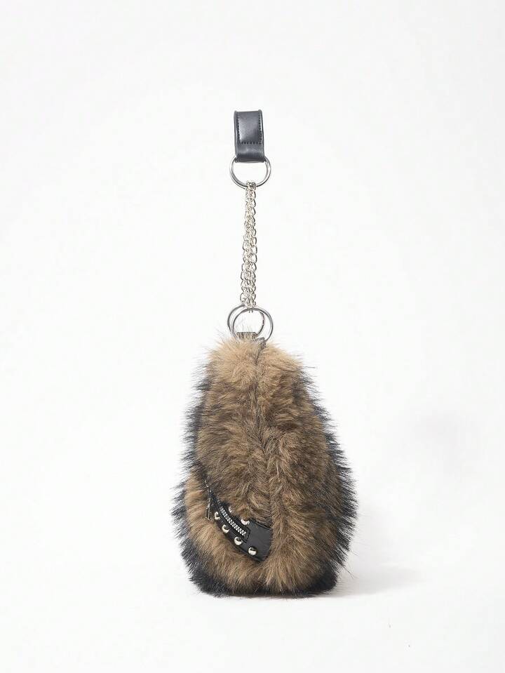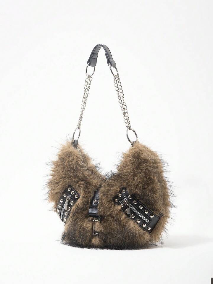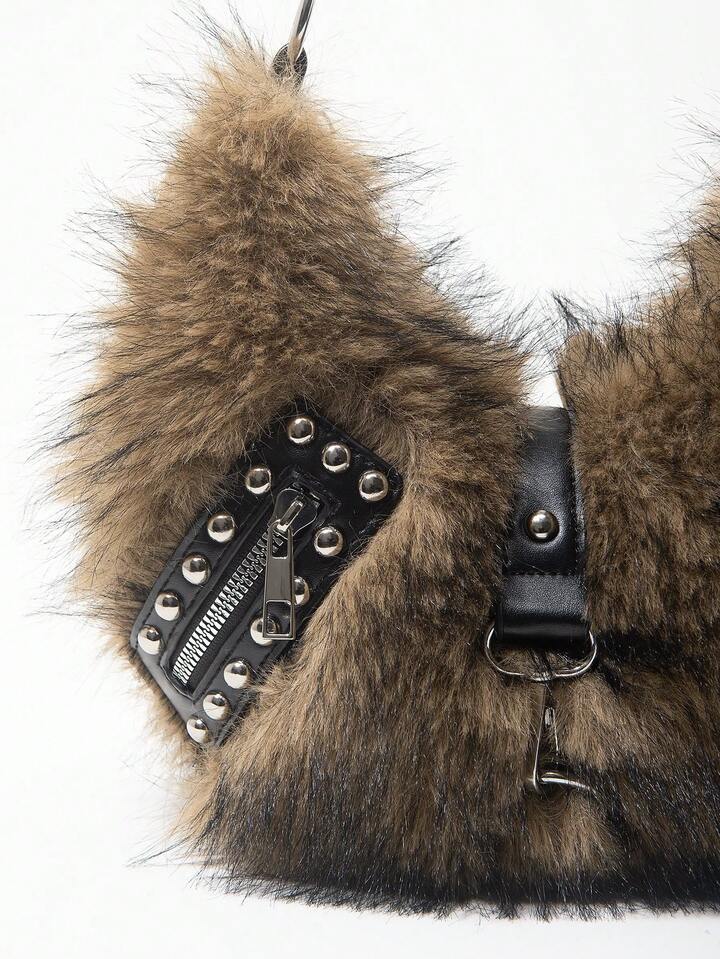 Grunge Punk Damen Umhängetasche, Hobo Tasche, Kunstfell, Plüsch, Nieten, modisch, personalisiert, vielseitig, Straße, süß und cool Mädchen, heiße Mädchen, Punk, Y2K, Alltag, Herbst und Winter (zufälliges Muster)