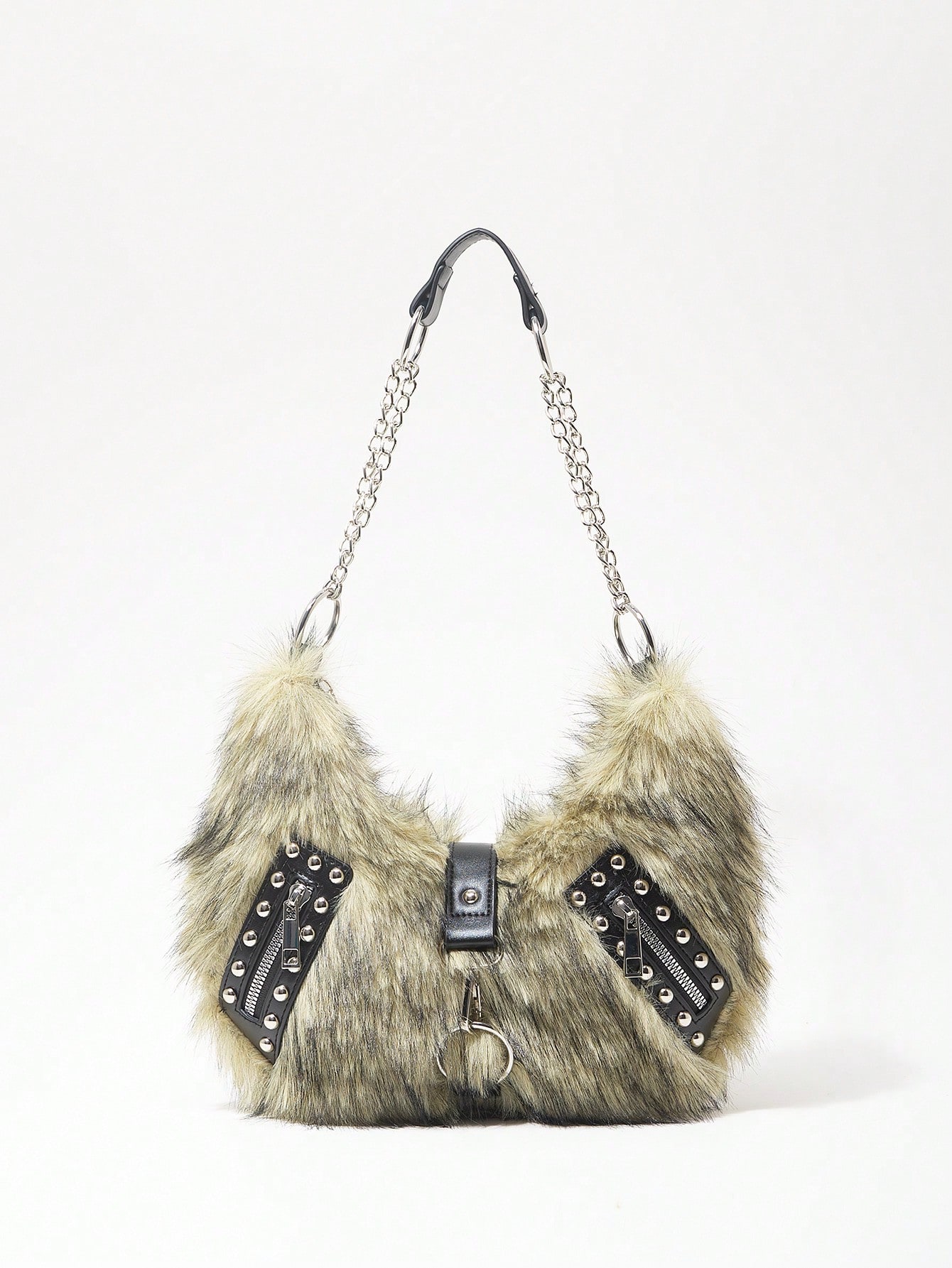 Grunge Punk Damen Umhängetasche, Hobo Tasche, Kunstfell, Plüsch, Nieten, modisch, personalisiert, vielseitig, Straße, süß und cool Mädchen, heiße Mädchen, Punk, Y2K, Alltag, Herbst und Winter (zufälliges Muster)
