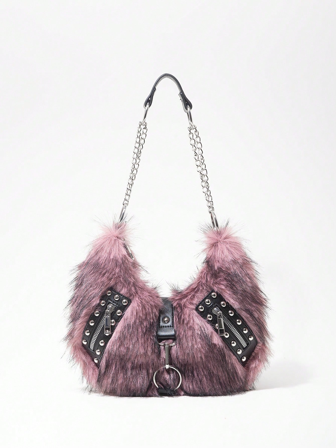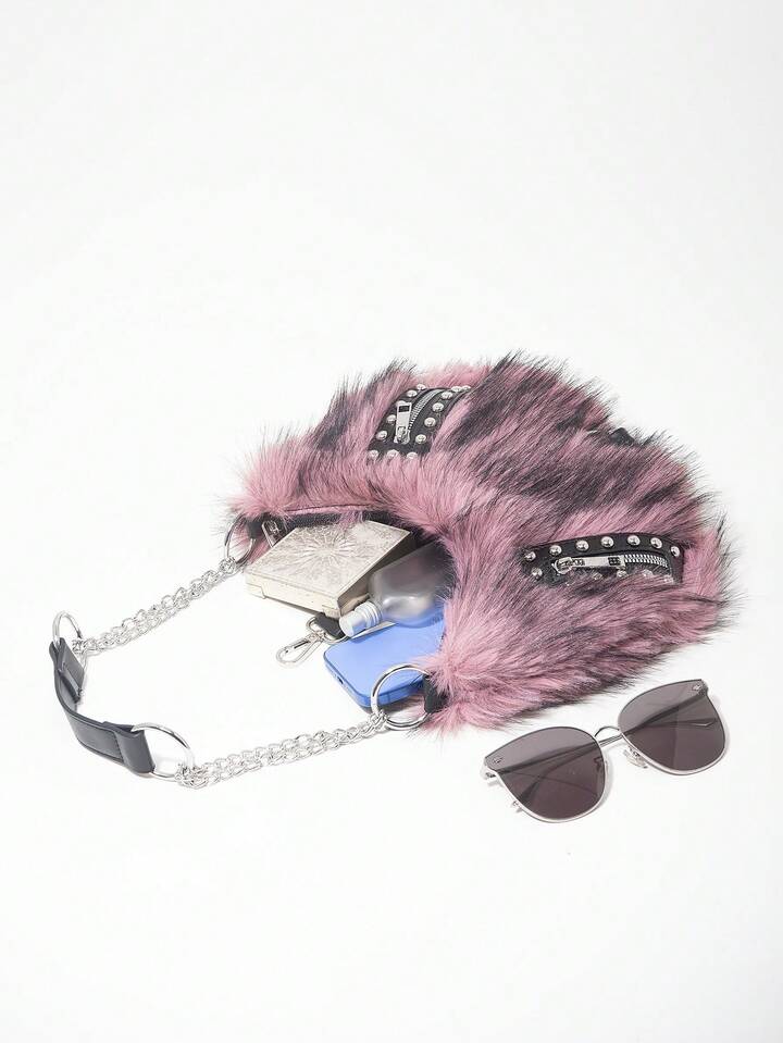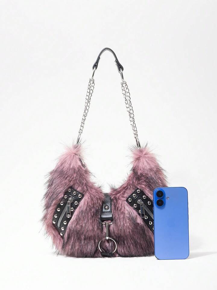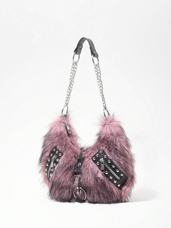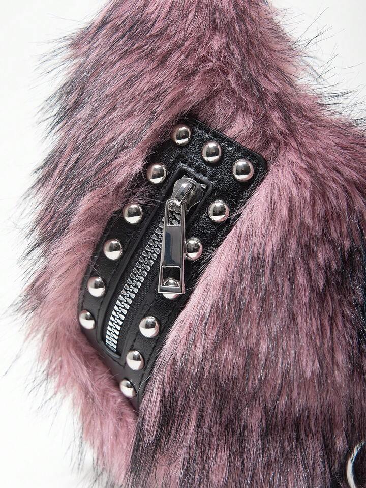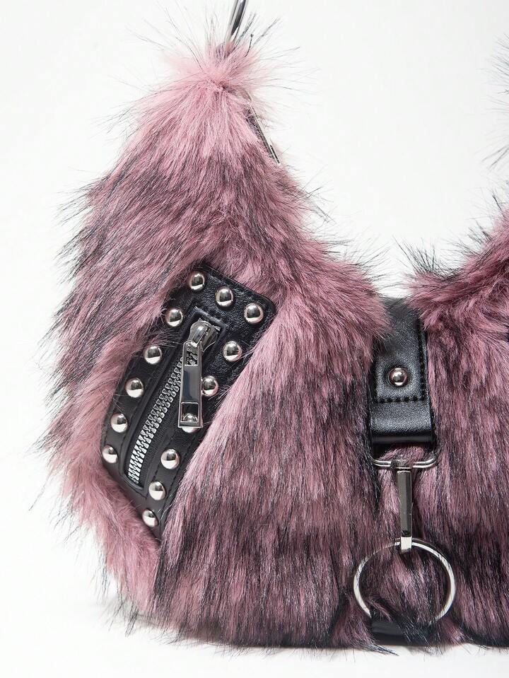 Grunge Punk Damen Umhängetasche, Hobo Tasche, Kunstfell, Plüsch, Nieten, modisch, personalisiert, vielseitig, Straße, süß und cool, Mädchen, Punk, Y2K, Alltag, Herbst und Winter (zufälliges Muster)