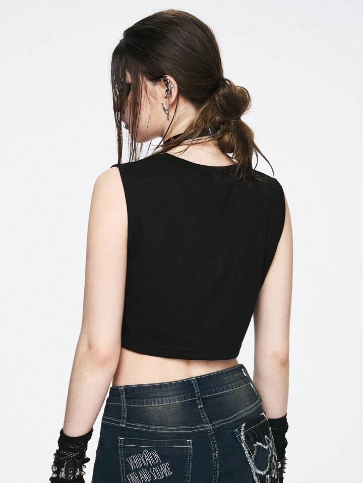 Grunge Punk Luftiges schwarzes Tanktop für Frauen im Punk-Stil mit Totenkopf-Buchstaben-Muster