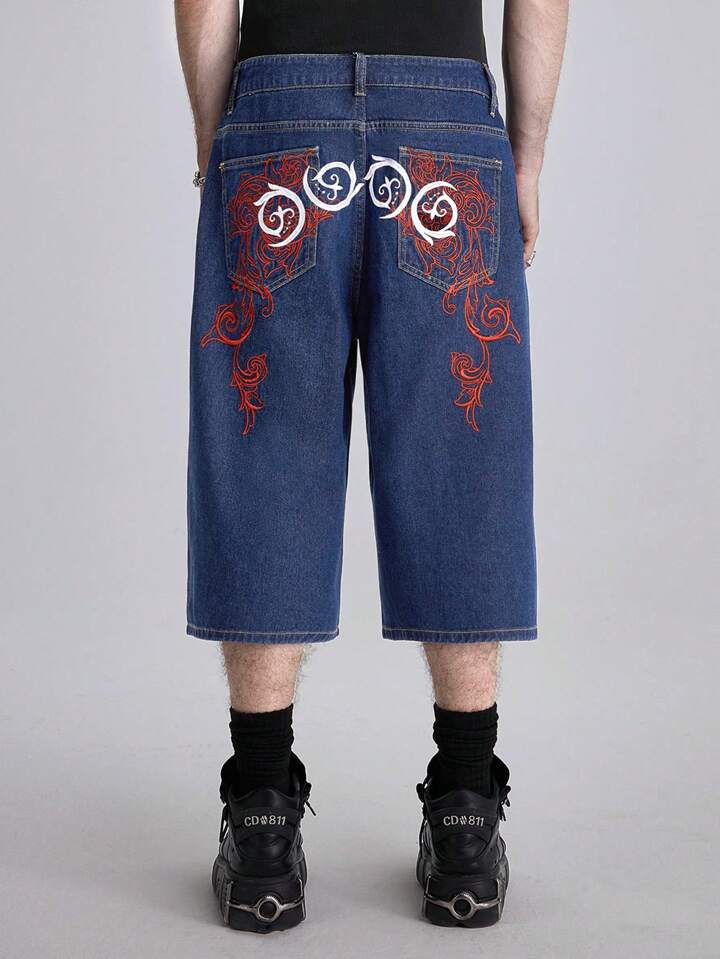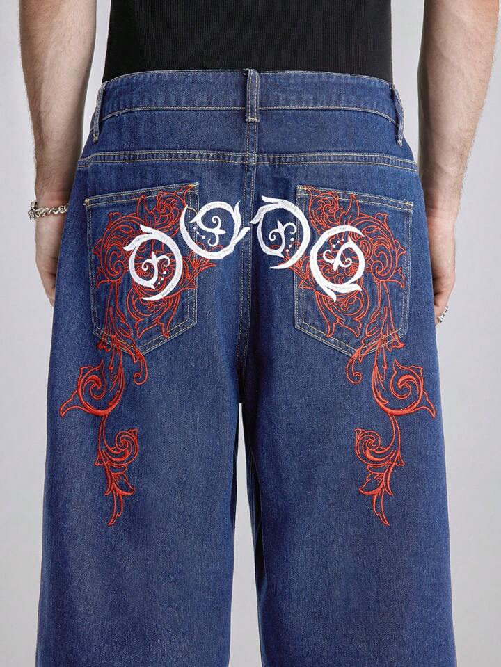 Grunge Punk Herren Jeans mit weitem Bein und floraler Stickerei, Schule
