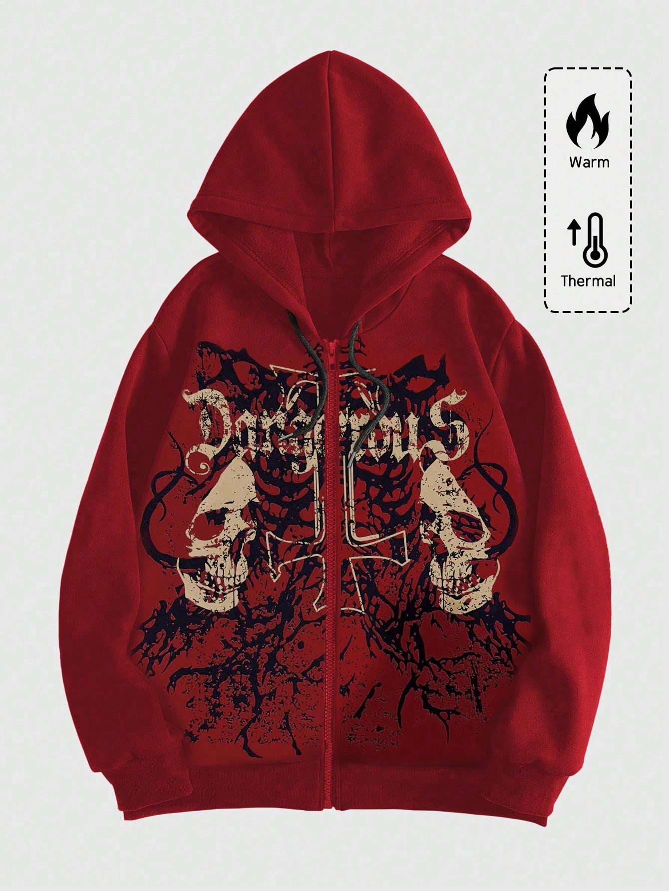 Grunge Punk Herren Rot Totenkopf Muster Langarm Hoodie, Schule, für Herbst Winter
