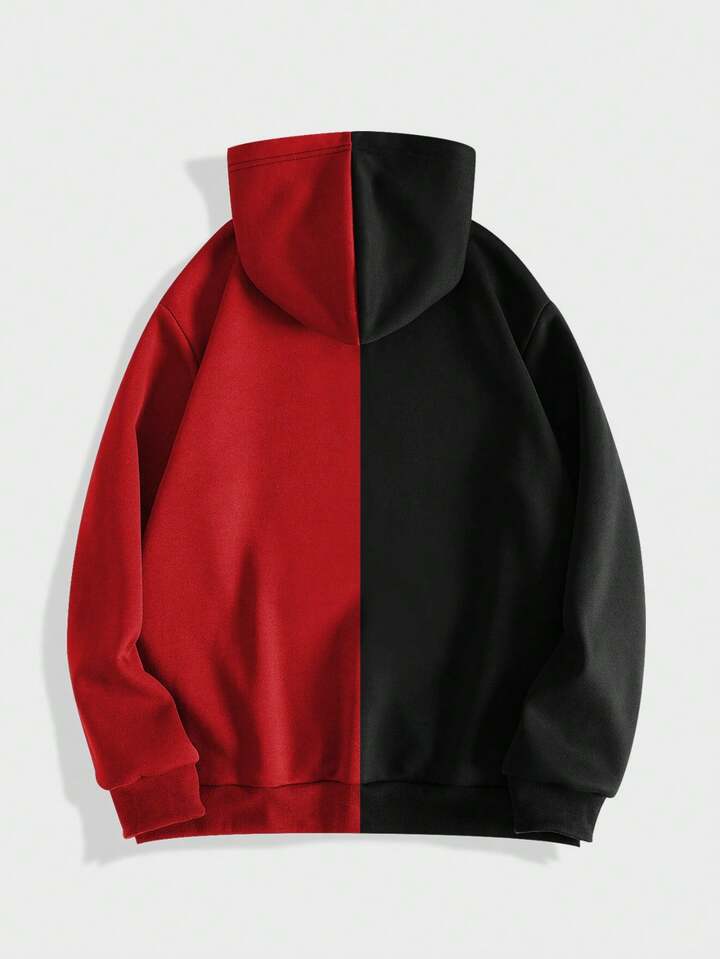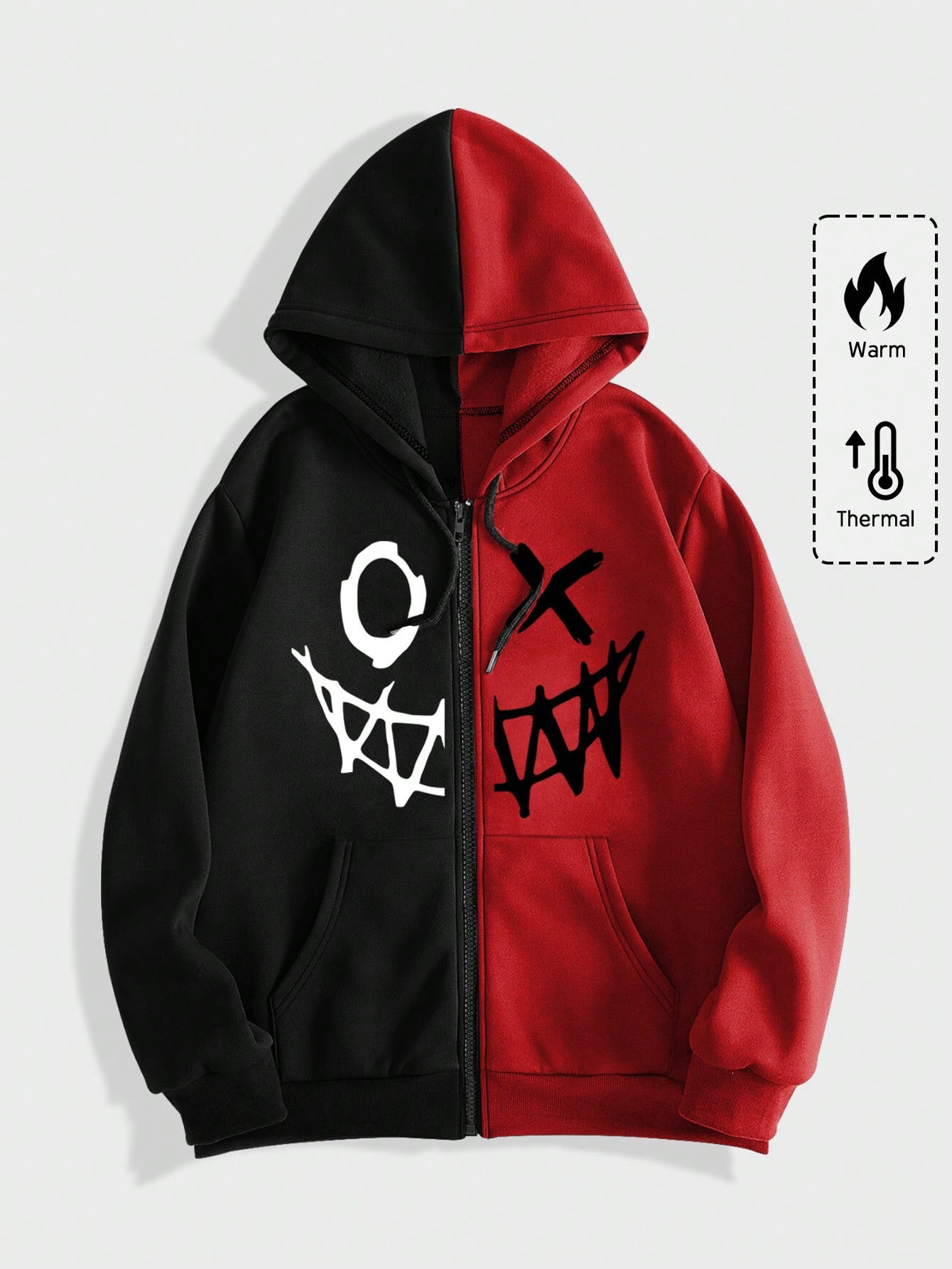 Grunge Punk Herren Zweifarbiger Cartoon-Grafik Reißverschluss Kordelzug Thermofutter Hoodie, Schule, für Herbst Winter