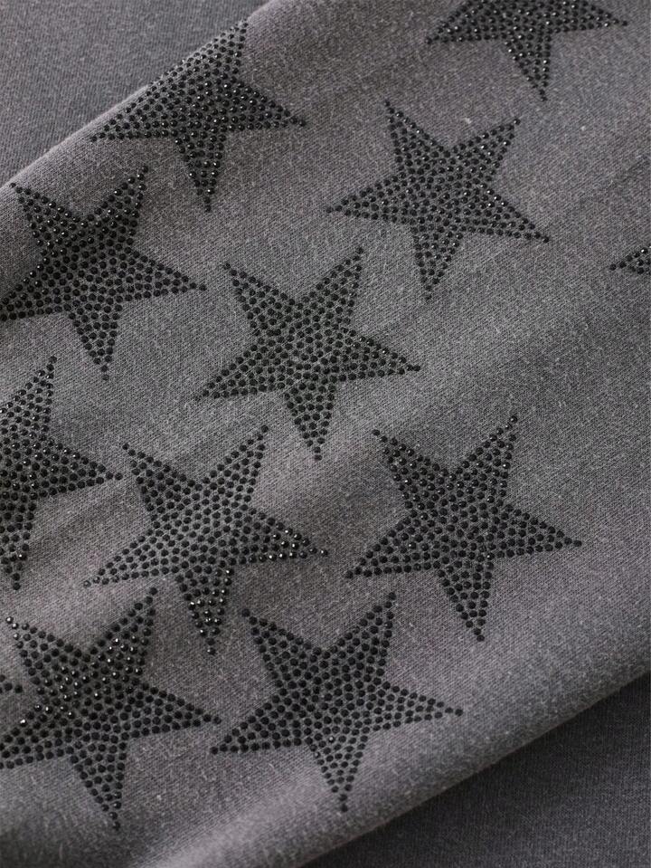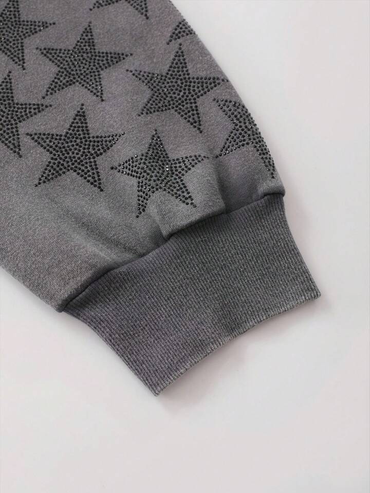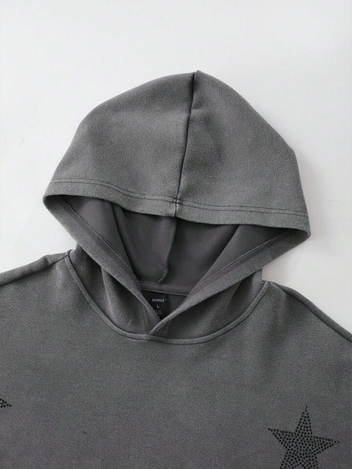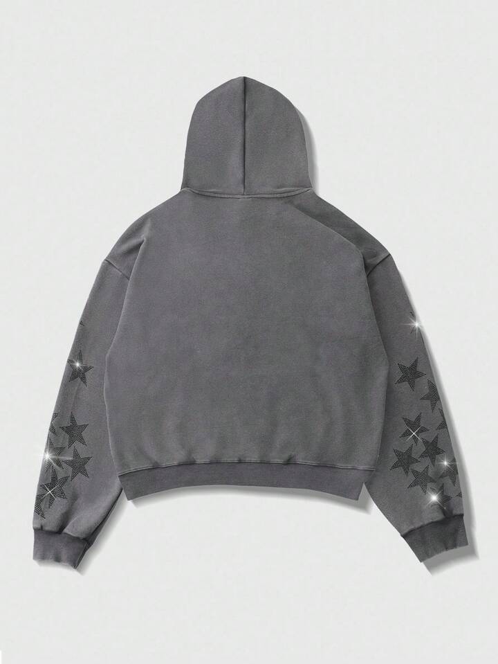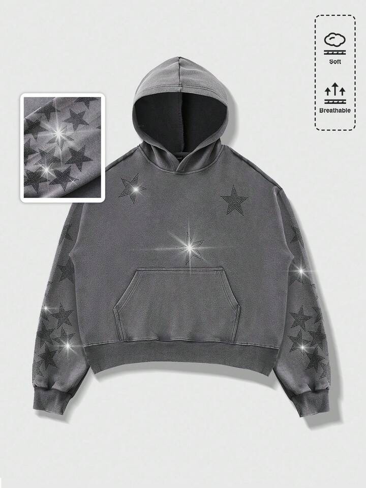 Grunge Punk Herren Hoodie Sweatshirt mit abgenutztem Strass-Stern-Grafik, locker geschnittener Crop-Fit, Herbst