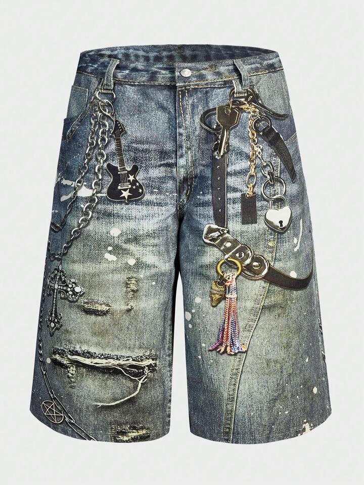 Herren Gitarre bedruckte, weite, lässige Jeans-Shorts