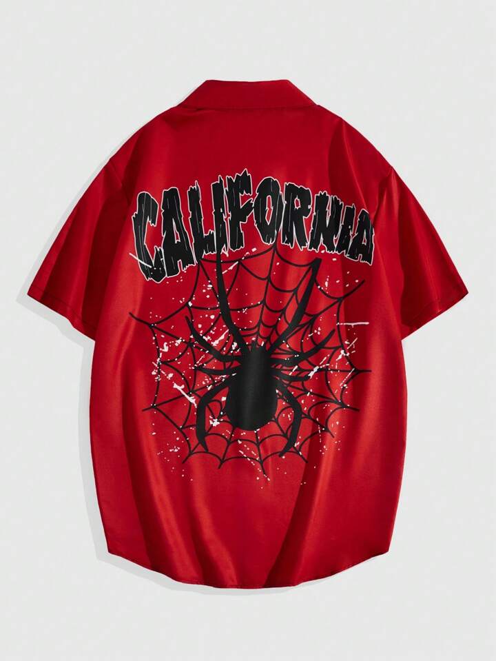 Grunge Punk Herren Spinnen & Buchstaben Muster Freizeit Kurzarm Hemd
