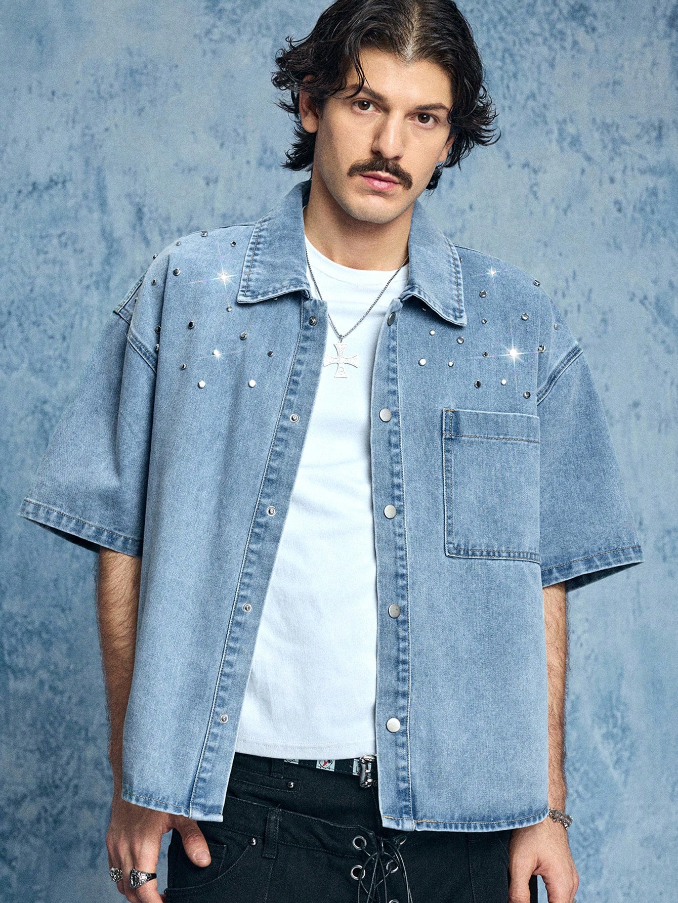 Grunge Punk Herren Hemd mit Kentkragen, Einreiher, Nieten, vielseitig für den täglichen Gebrauch, Kurzarm Jeanshemd