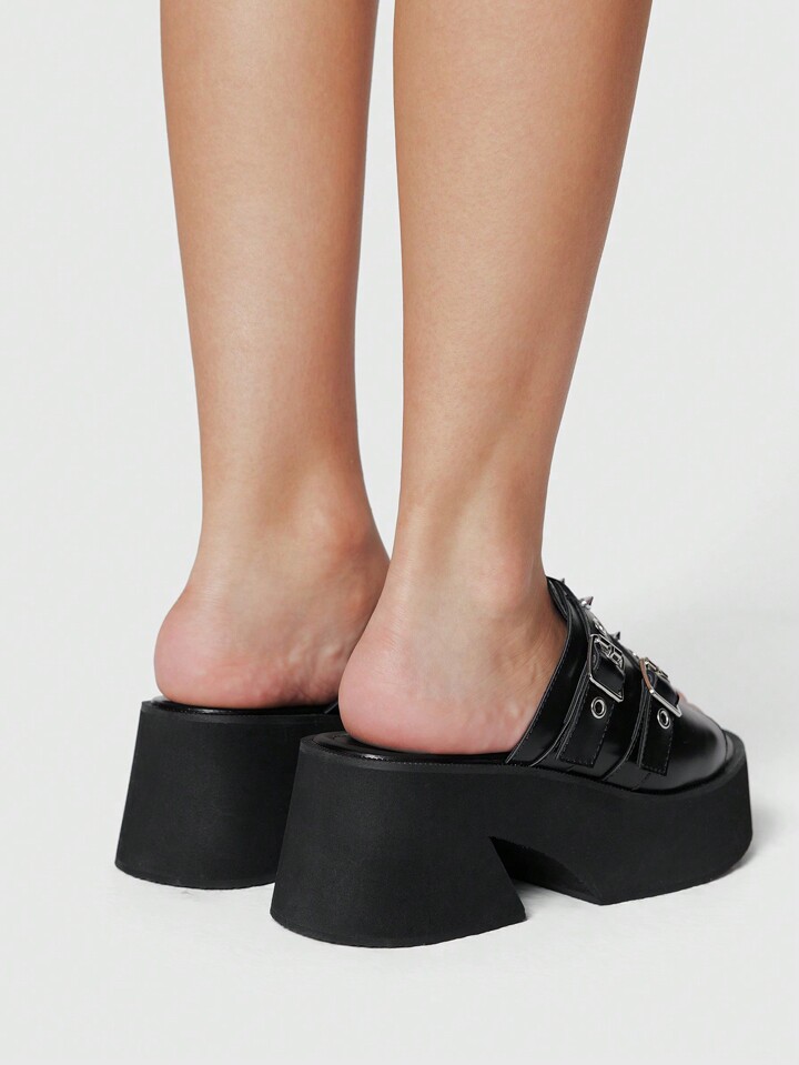 Grunge Punk Sandalen mit mehreren Schnallen, runder Zehenbereich, dicker Sohle, Keilabsatz, aus PU-Material im Punk-Stil, schwarz, römisch, geeignet für Abschlussfotos, berufliches Tragen