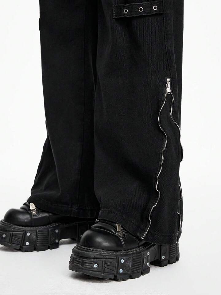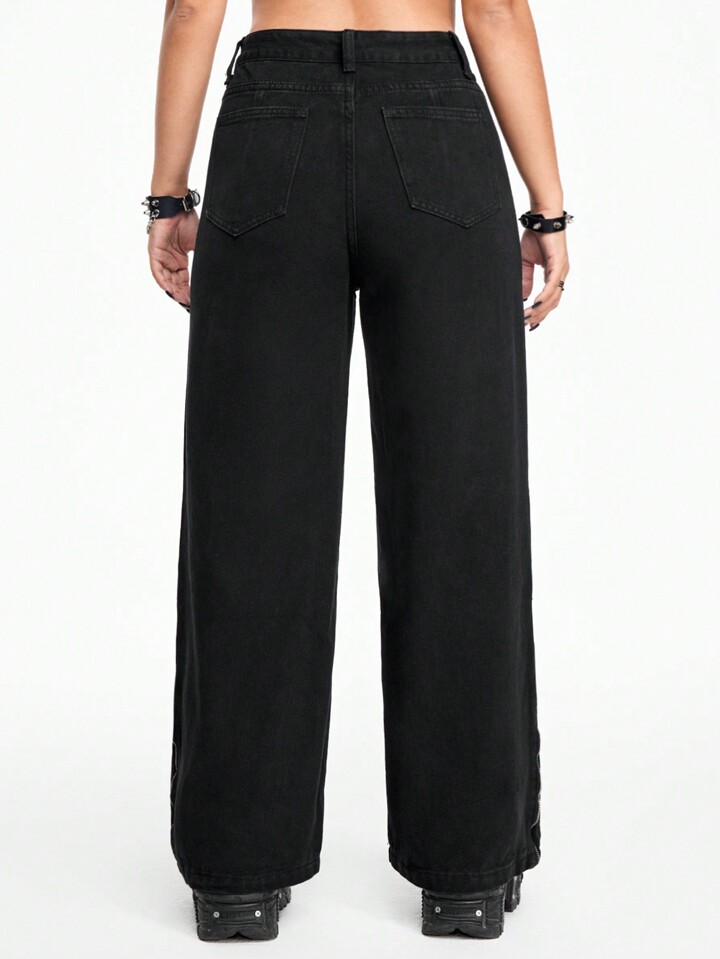 Grunge Punk Musik Festival Punk Rot und Schwarz Lässige, vielseitige Street Style Jeans für Frauen mit Ösen, Schnürung, 3D Taschen und Reißverschluss, locker geschnitten