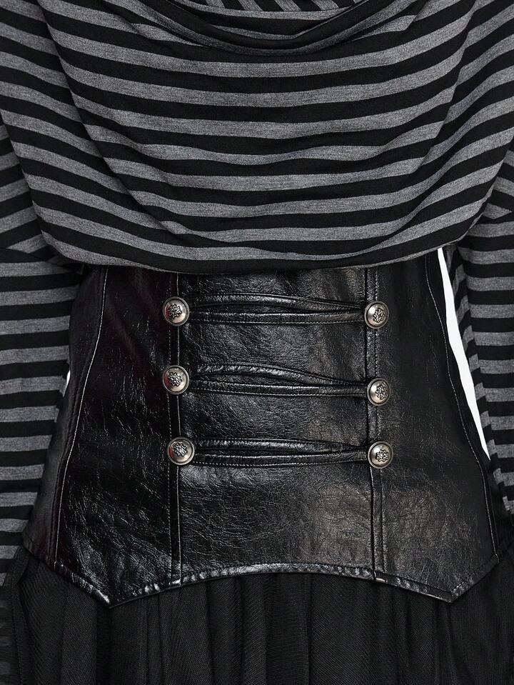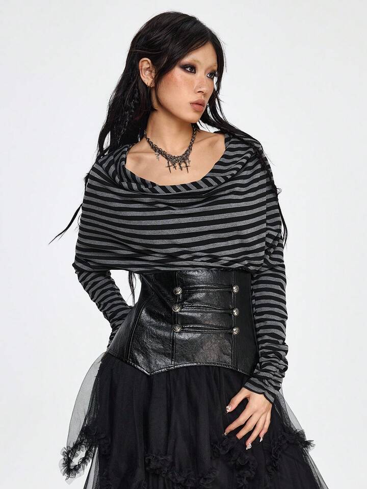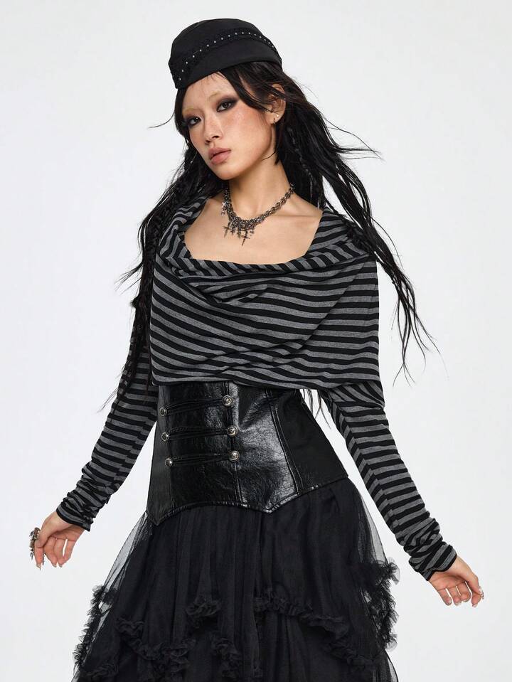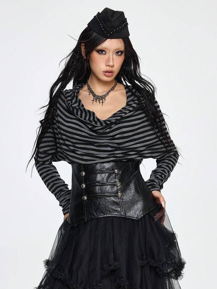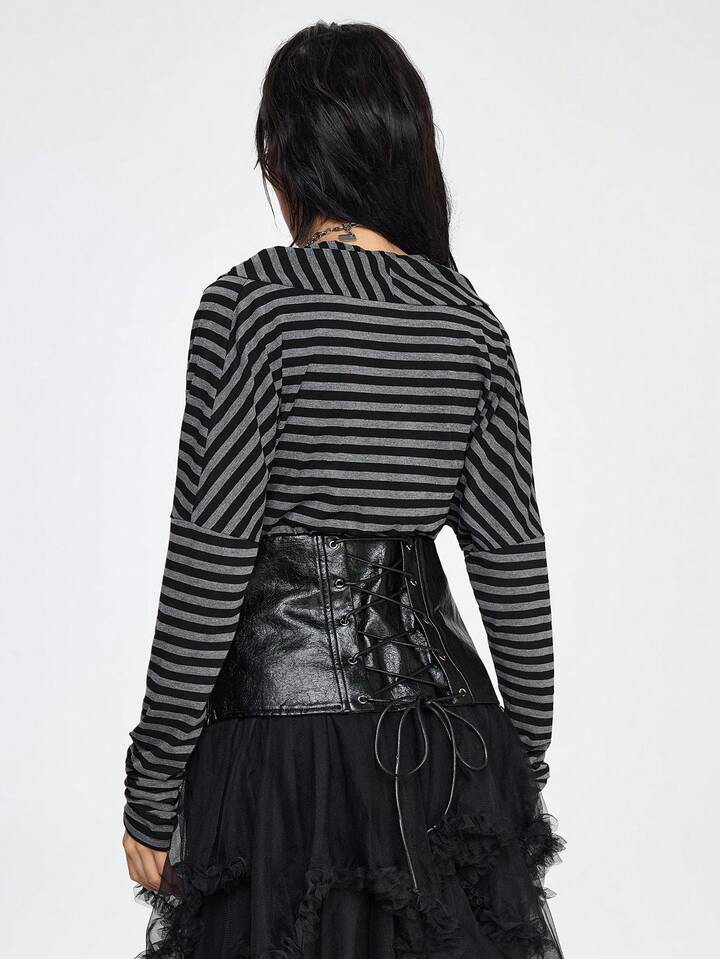Grunge Punk Maritimer Punk Retro Schwarz & Grau gestreifter Patchwork PU Kragen Figurbetontes T-Shirt