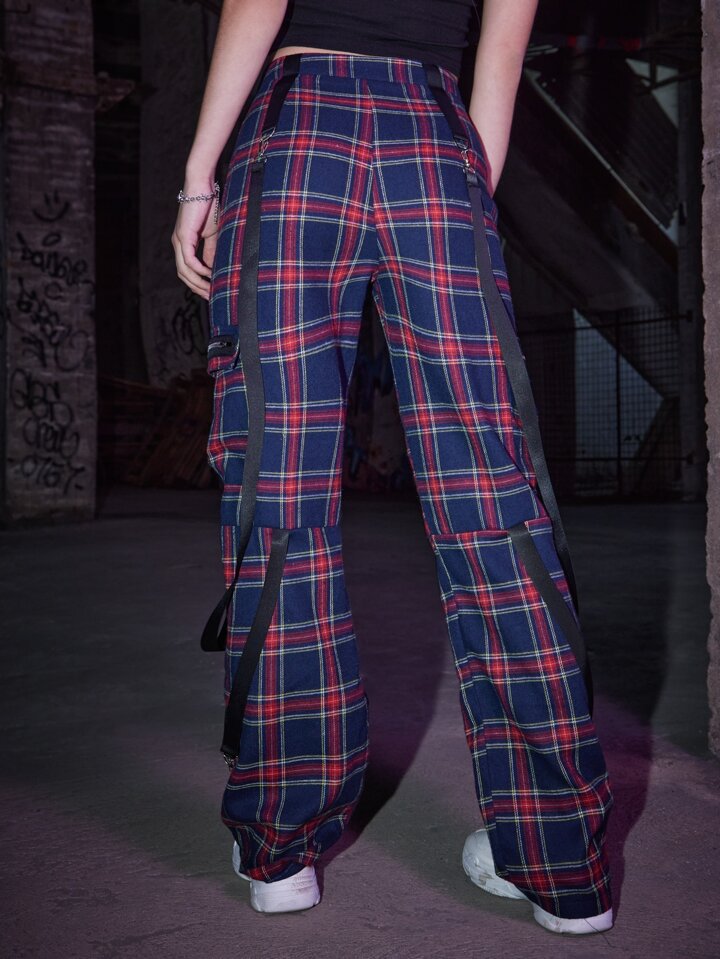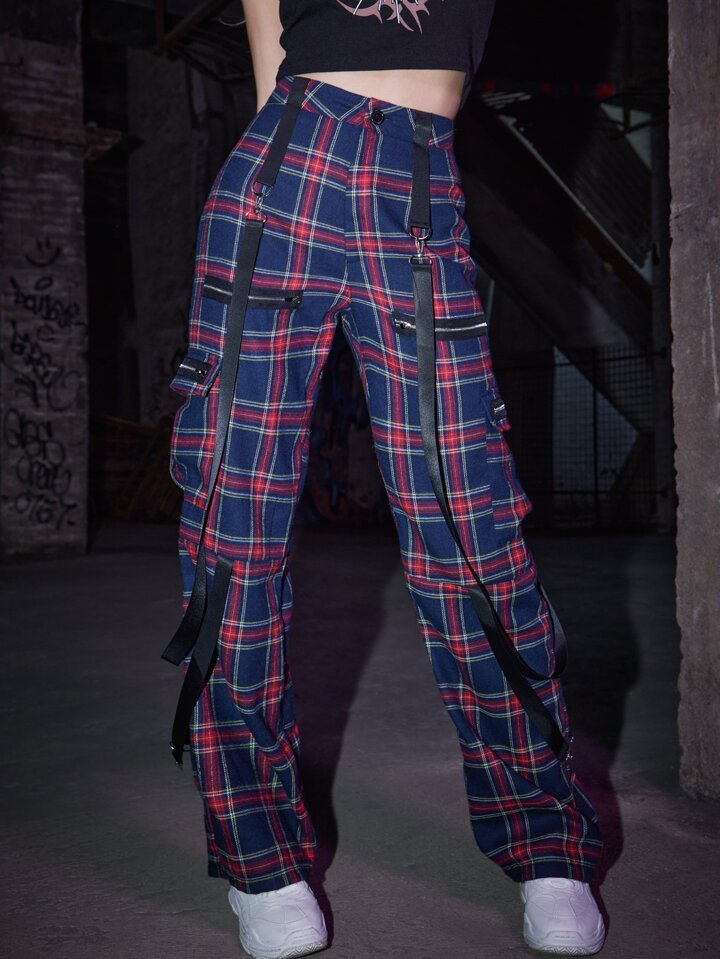Grunge Punk Cargo Hose mit Plaid Muster, Reißverschluss, Band