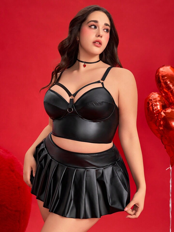Grunge Punk Sexy Set aus Große Größen Leder-Plisseerock im dunklen Punk-Stil und metallloser Büstenhalter