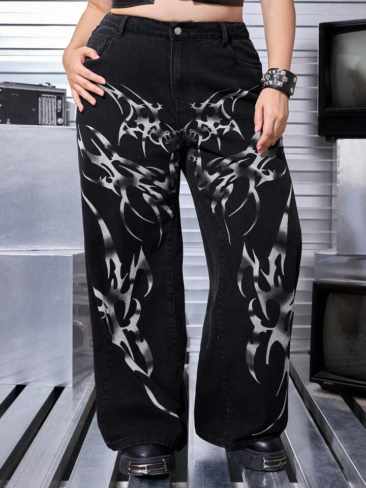Grunge Punk Damen Große Größen Loose Fit Wide-Leg Jeans mit asymmetrischem Muster