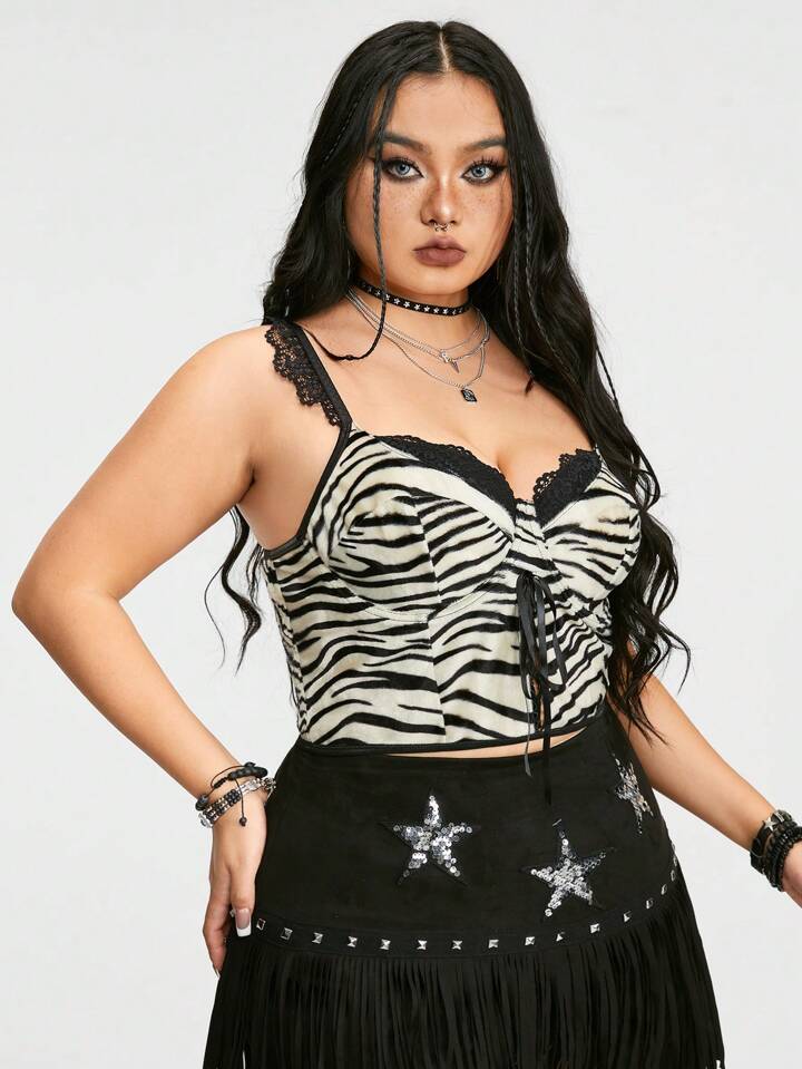 Grunge Punk Große Größen Tanktop im Bohème-Stil mit Spitzenbesatz und Blumenspleißung, Tier-Print und Bindeträger
