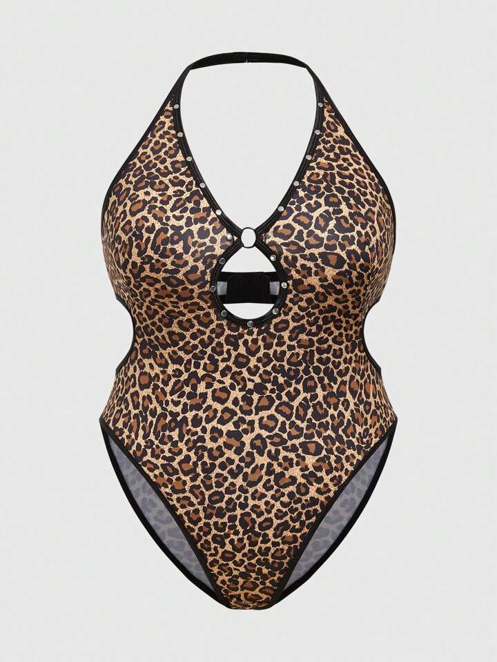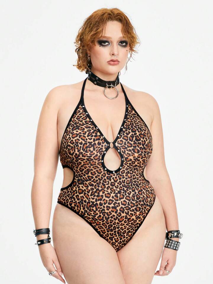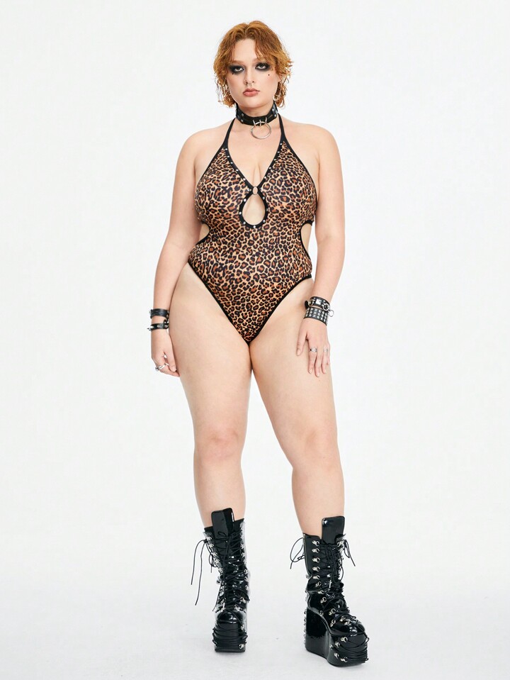 Grunge Punk Damen Body Mit Leo-print In Dunklem Punk-stil Und Schlüsselloch-halterung Große Größen Mit Netzriemen