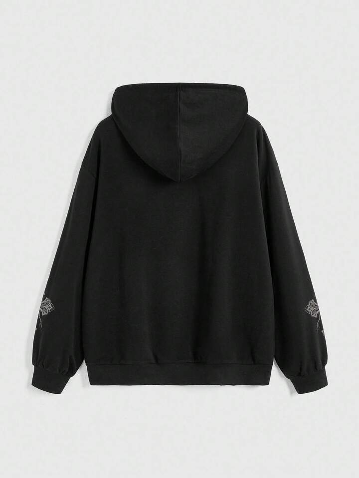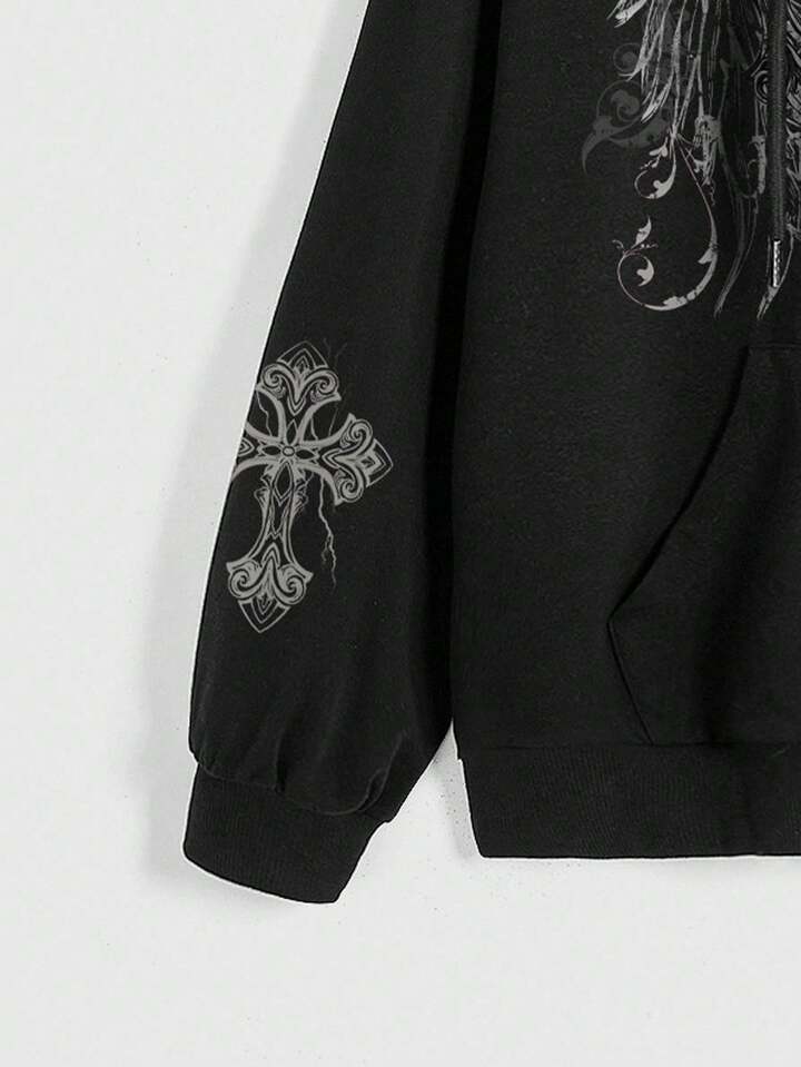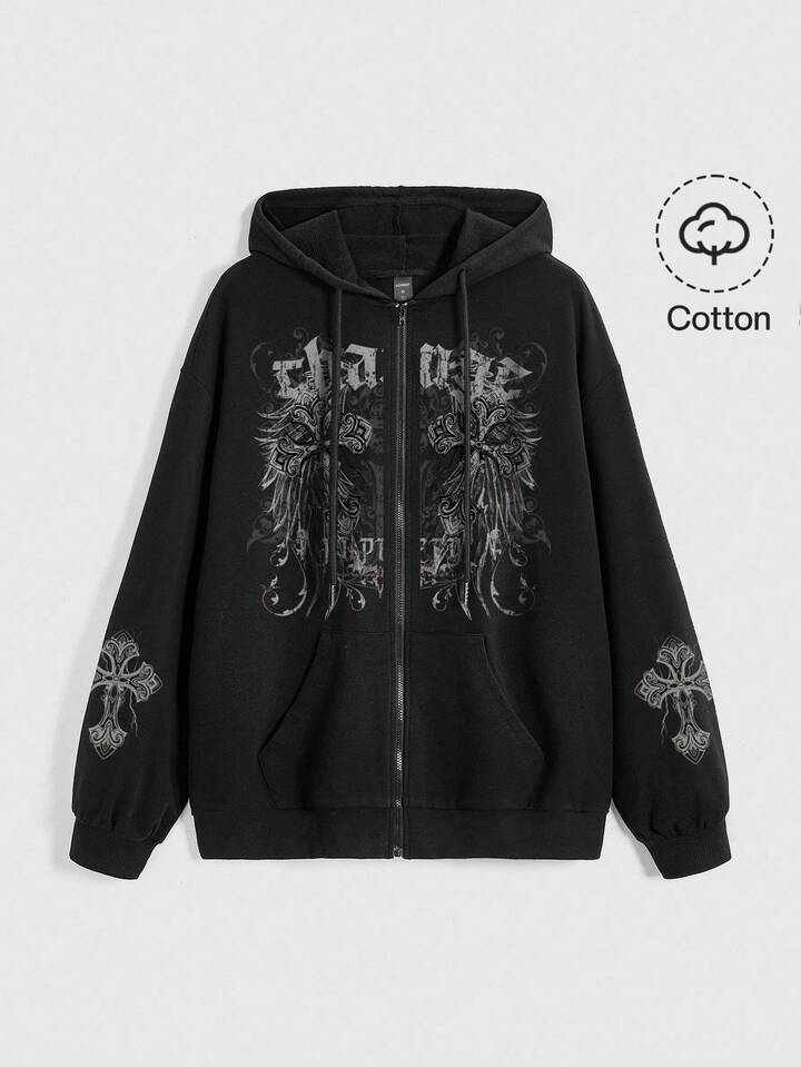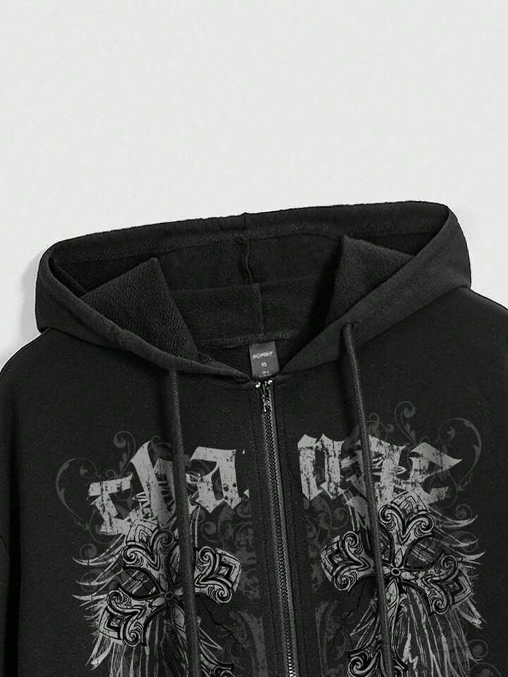 Grunge Punk Punk Rock Musik Festival Frühlings Sweatshirt, Damen Kapuzen Sweatshirt mit Kreuz Muster, Reißverschluss, Taschen, Schwarz