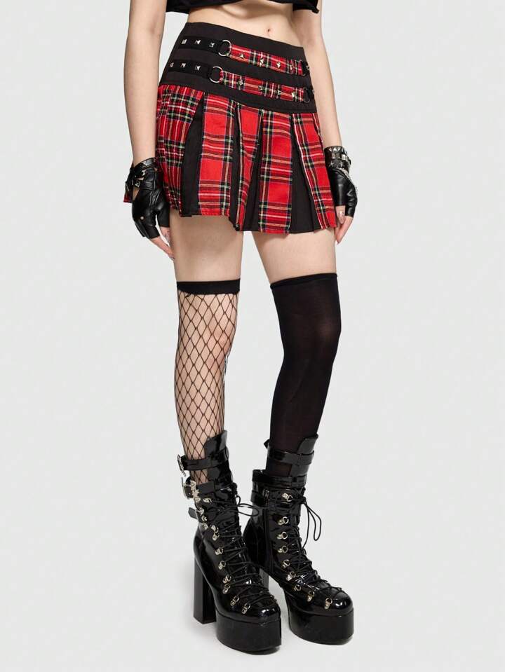 Grunge Punk Mini Rock Im Punk-stil Mit Rotem Karomuster, Metalldekoration Und Patchwork, Perfekt Für Valentinstag