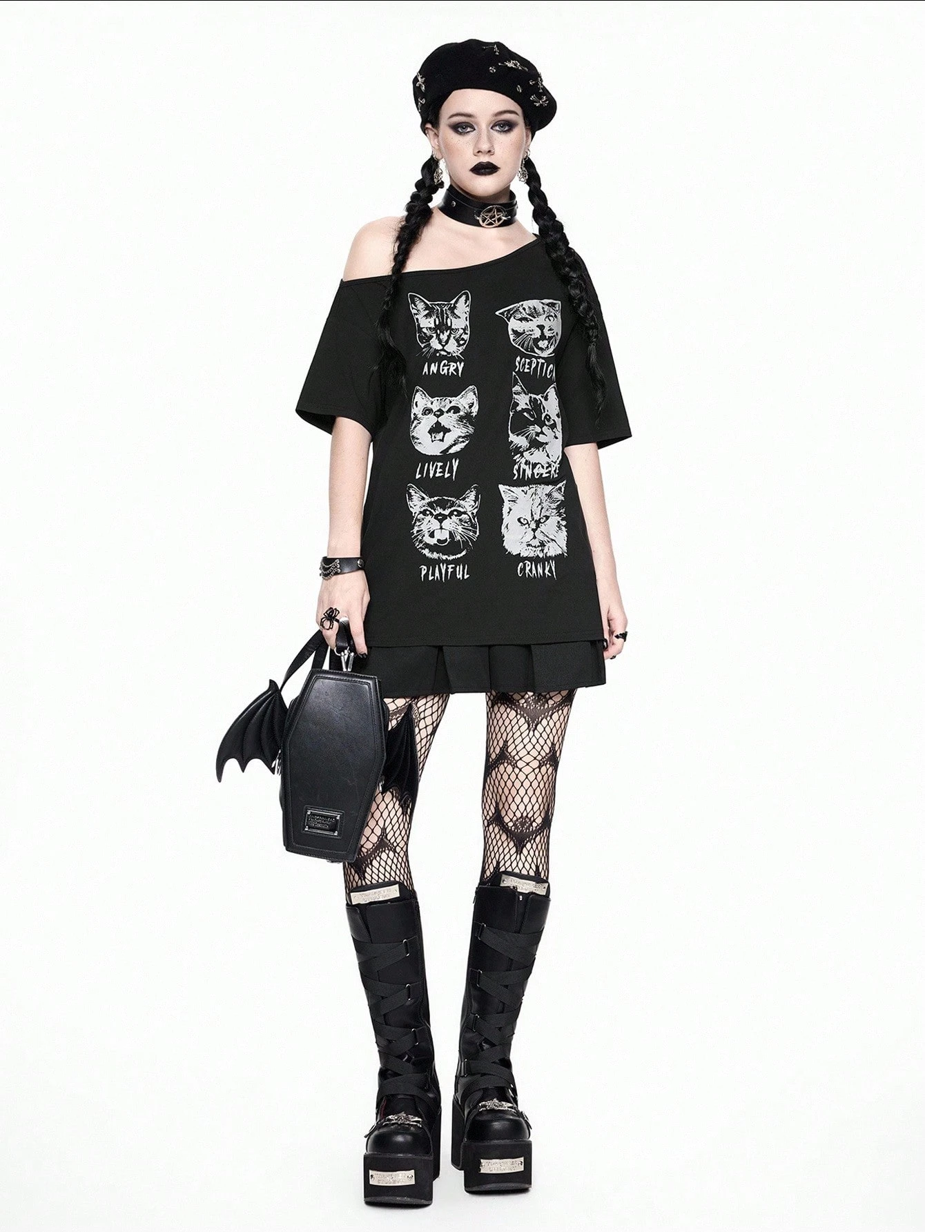 Grunge Punk Punk Y2K Katzen-Muster Loose Fit Asymmetrisches Ausschnitt T-Shirt