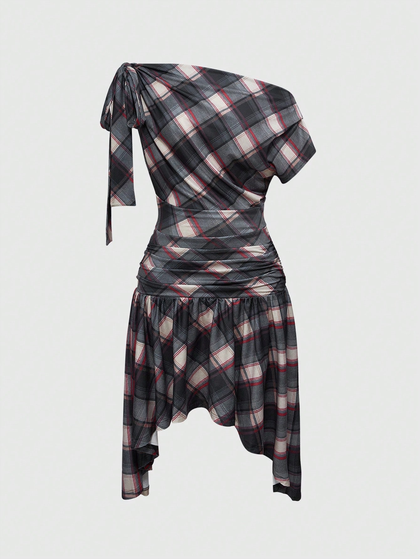 Grunge Punk Retro-elegantes asymmetrisches Schulterdesign, Taillen-Raffung, asymmetrischer Saum mit Karomuster Kleid
