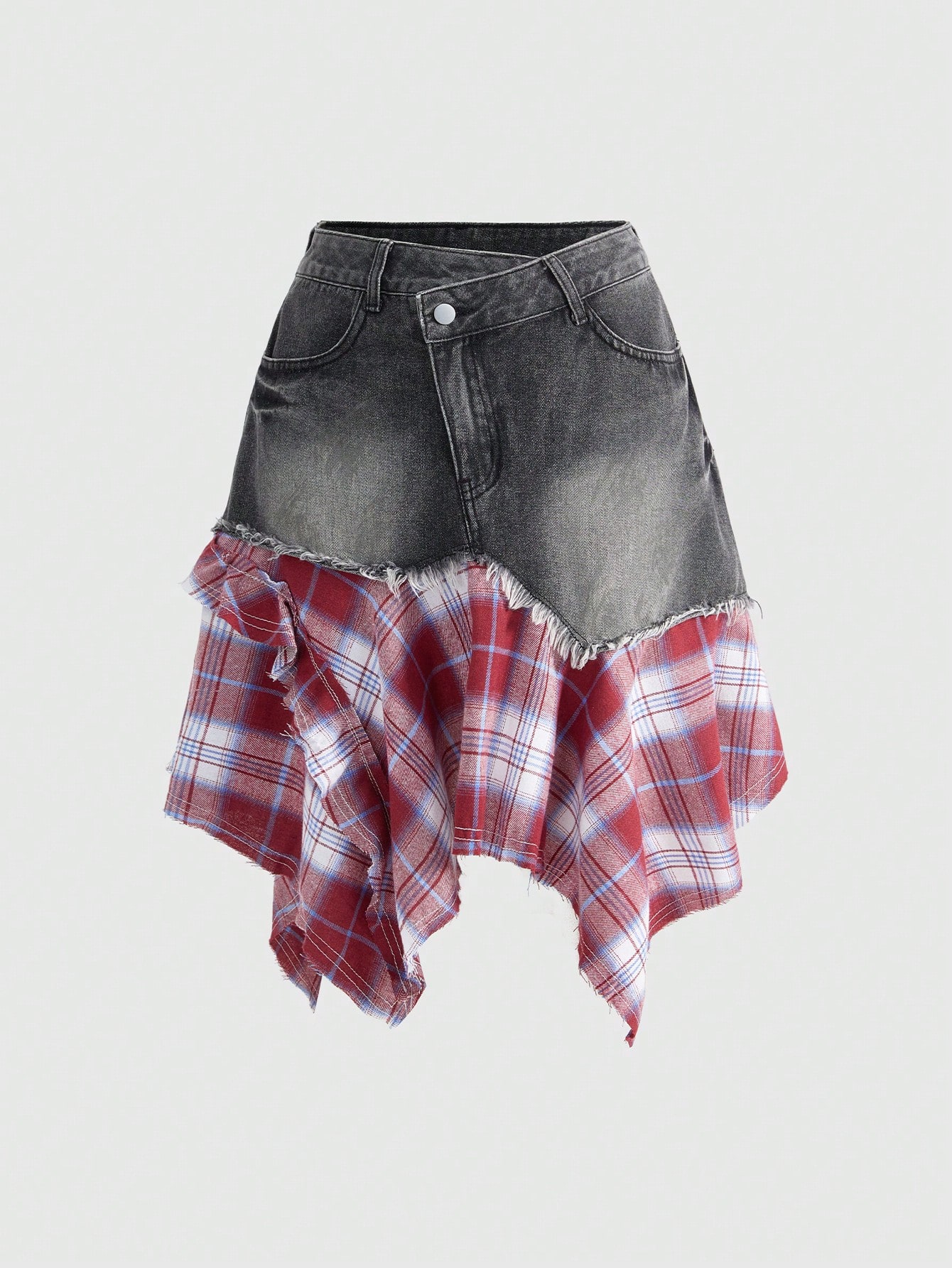 Grunge Punk Romantisch Punk, Collegestil Denim Patchwork Karomuster Asymmetrischer Saum Damen Denim Minirock