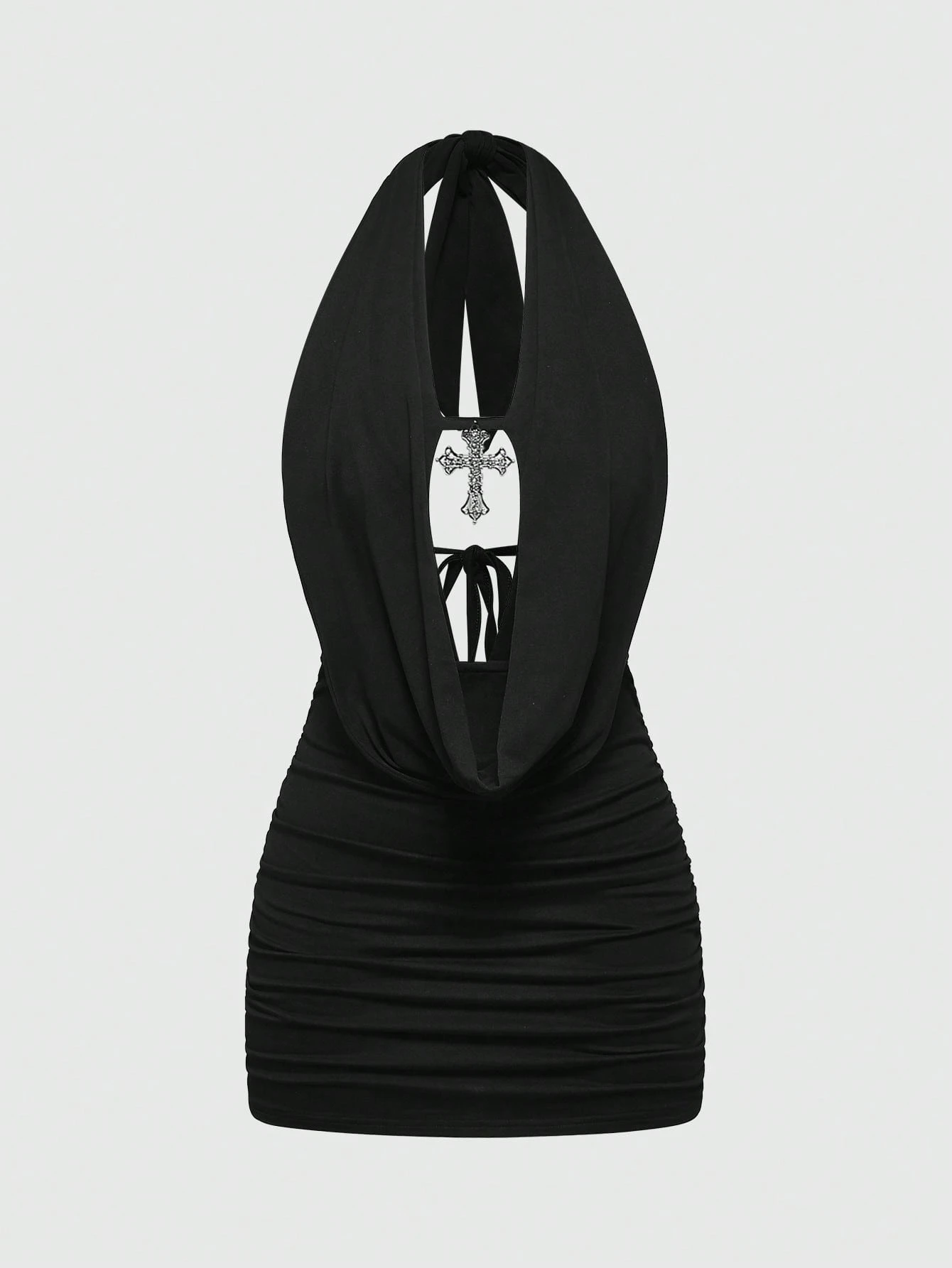 Grunge Punk Sexy Leoparden-Muster Kreuz-Anhänger Schnürung drapierte Ausschnitt Mini-Kleid für Frauen, geeignet für Strandurlaub, Gyaru Konzertoutfit