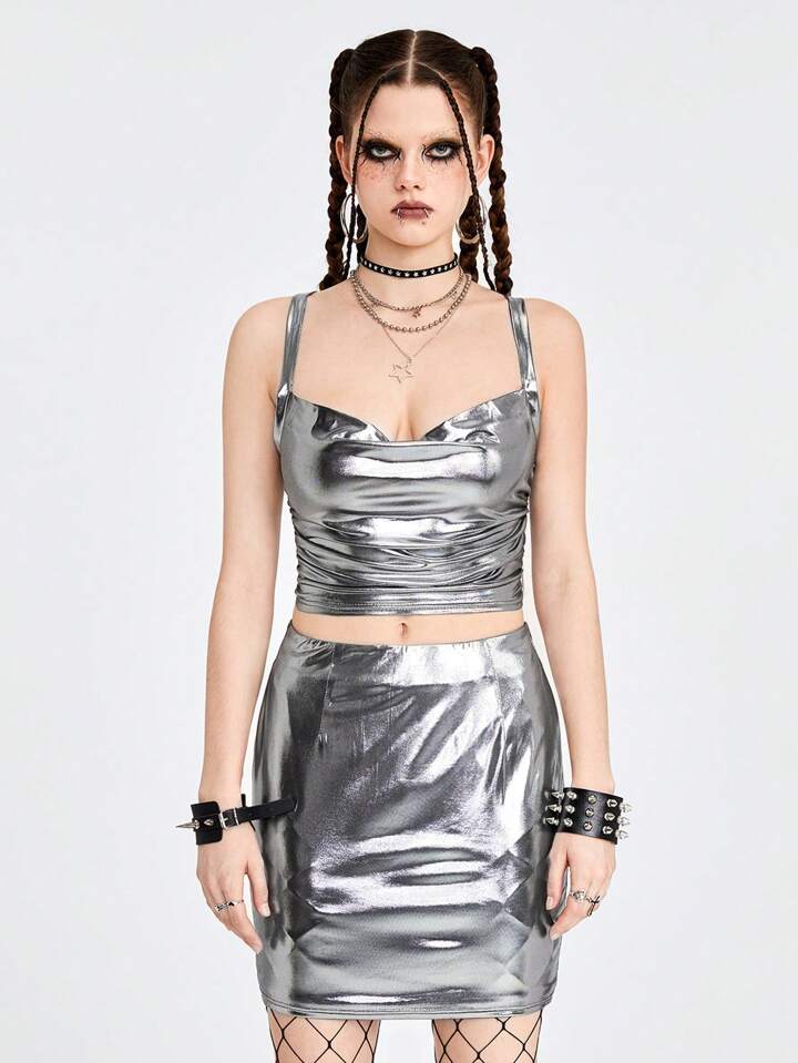 Grunge Punk Sexy Musikfestival Laserbeschichtete reflektierende Damen Cami Top- und Bodycon Rock-Set