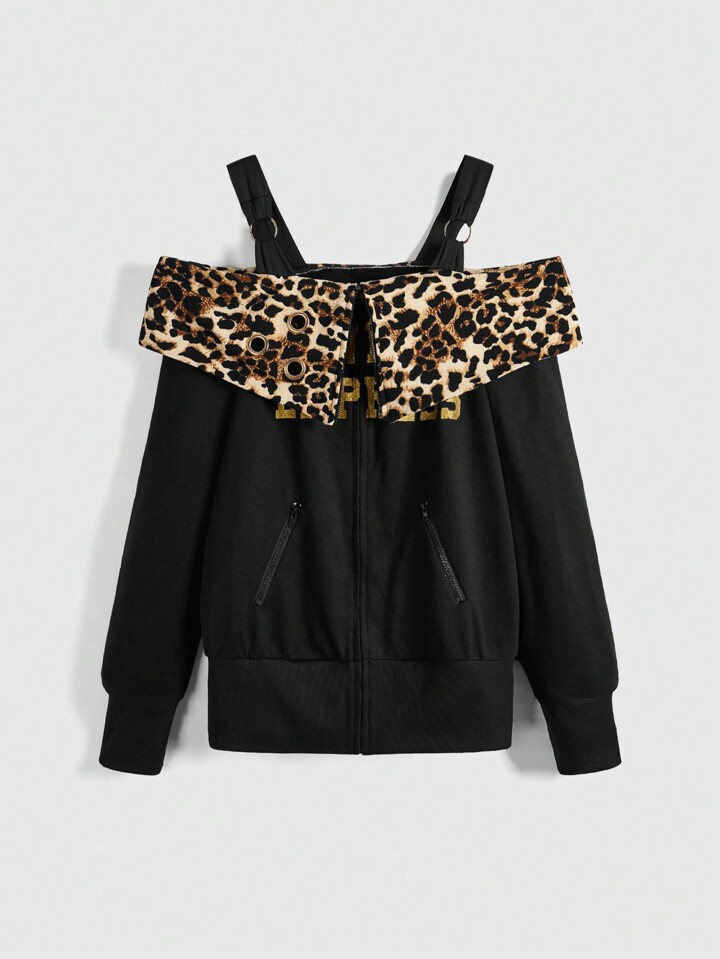 Grunge Punk Shibuya Style Y2K Gyaru Leoparden Muster & Metallic Grafik Oversized Reißverschluss Hoodie