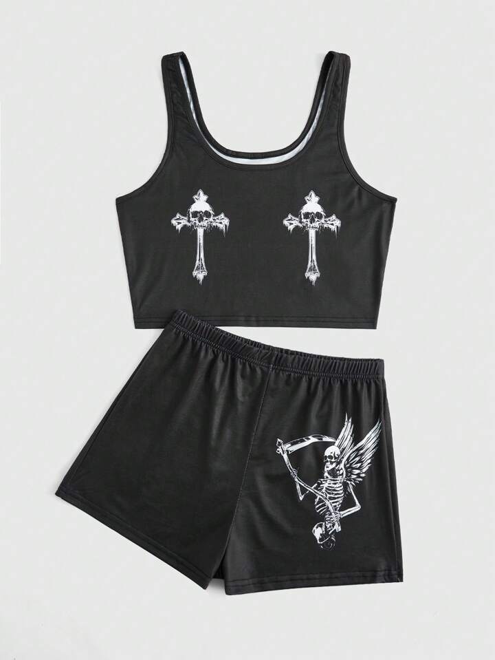Grunge Punk Skelett Muster, Tank Top mit & Shorts mit Pyjama Set mit