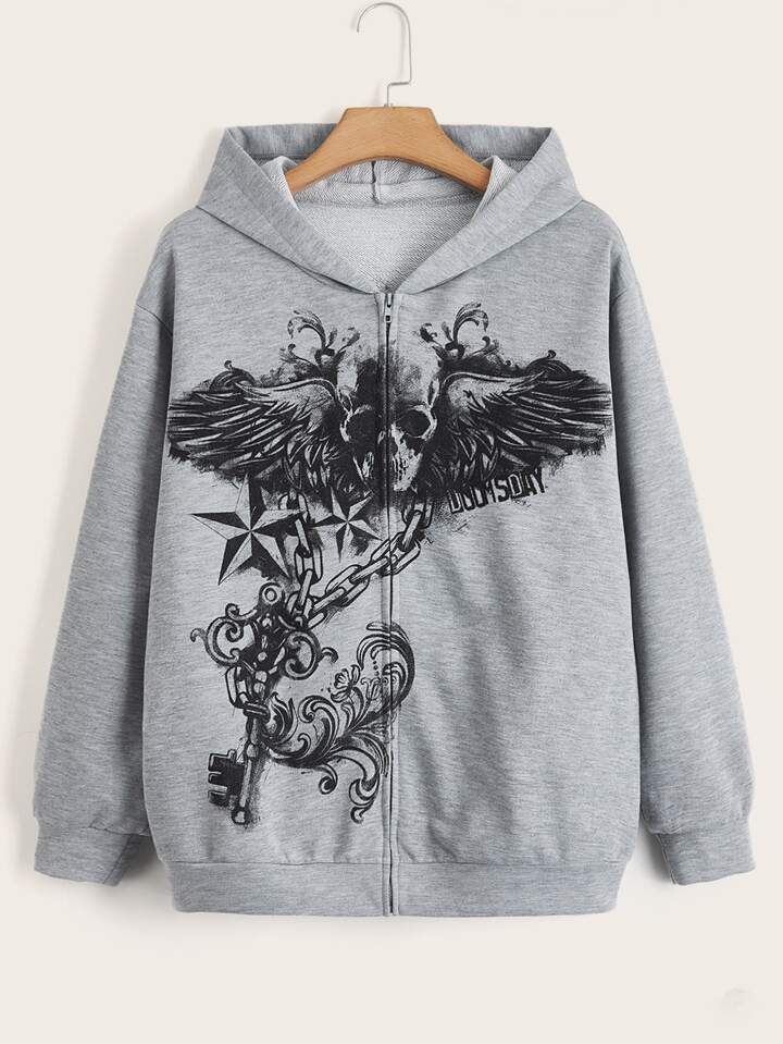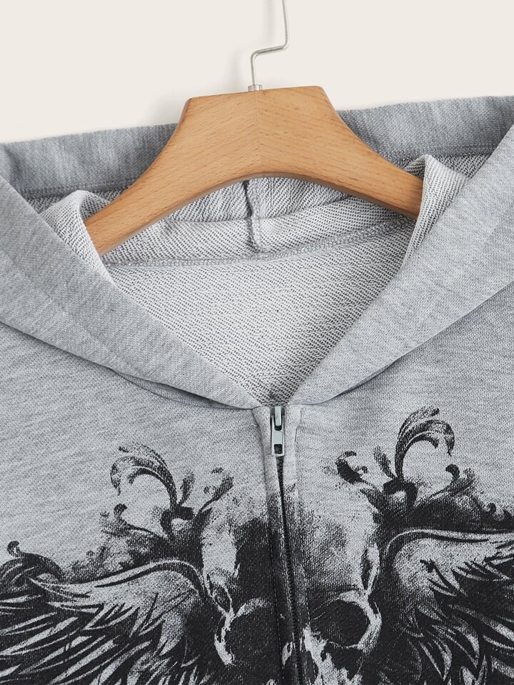Grunge Punk Kapuzenpullover mit Reißverschluss Schädel & Blume Grafik