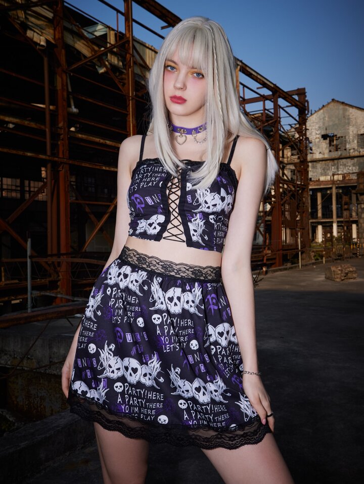 Grunge Punk Schädel Muster, Band Cami & Spitzenbesatz Rock