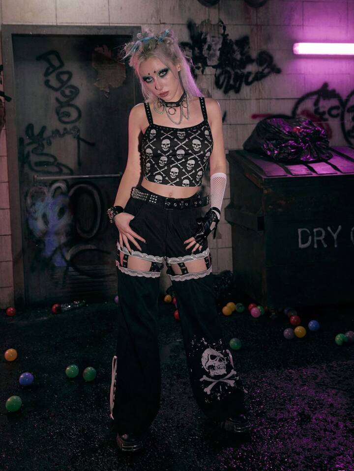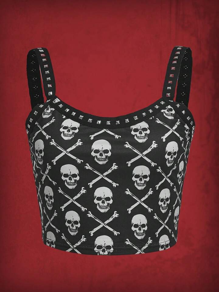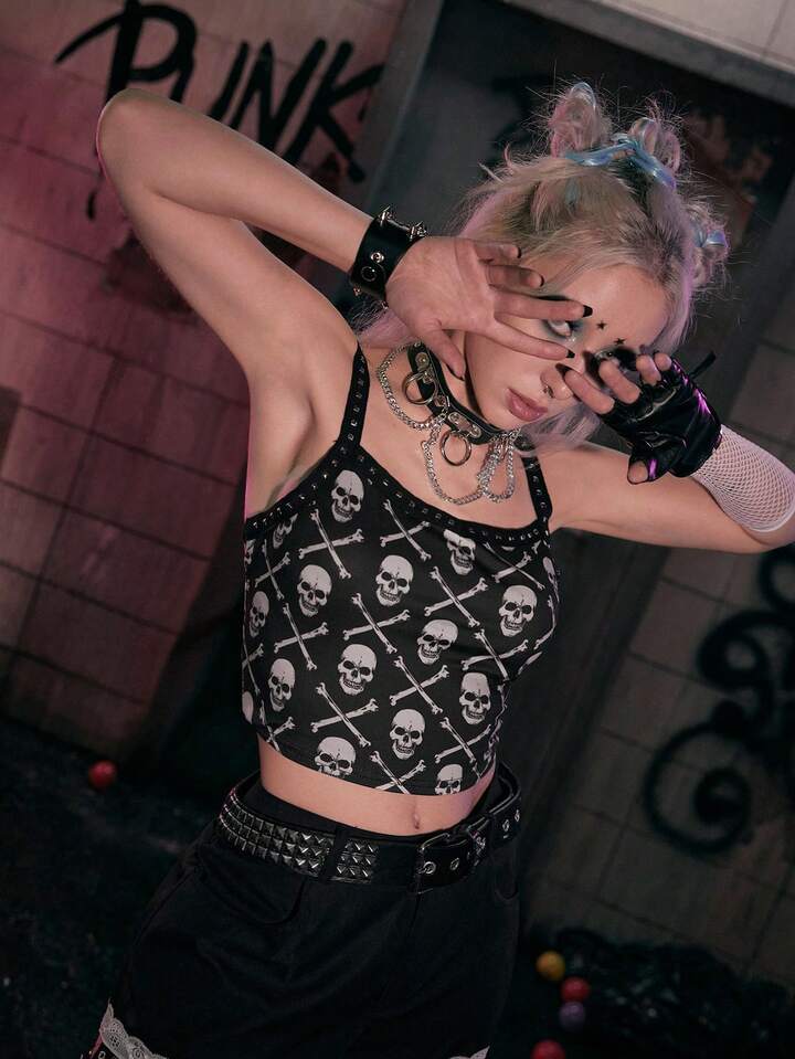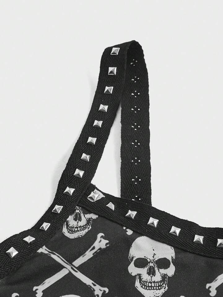 Grunge Punk Cami Top mit Schädel Muster, Nieten Dekor,