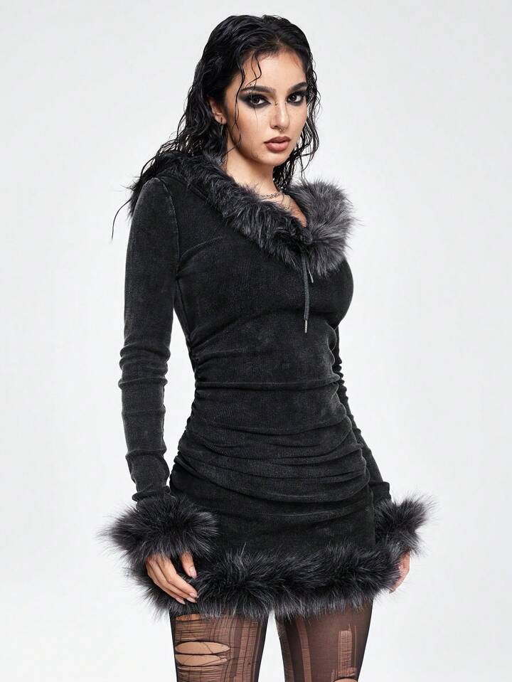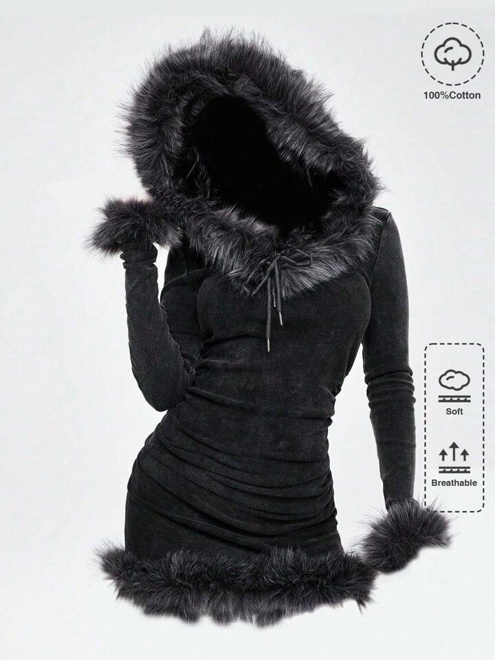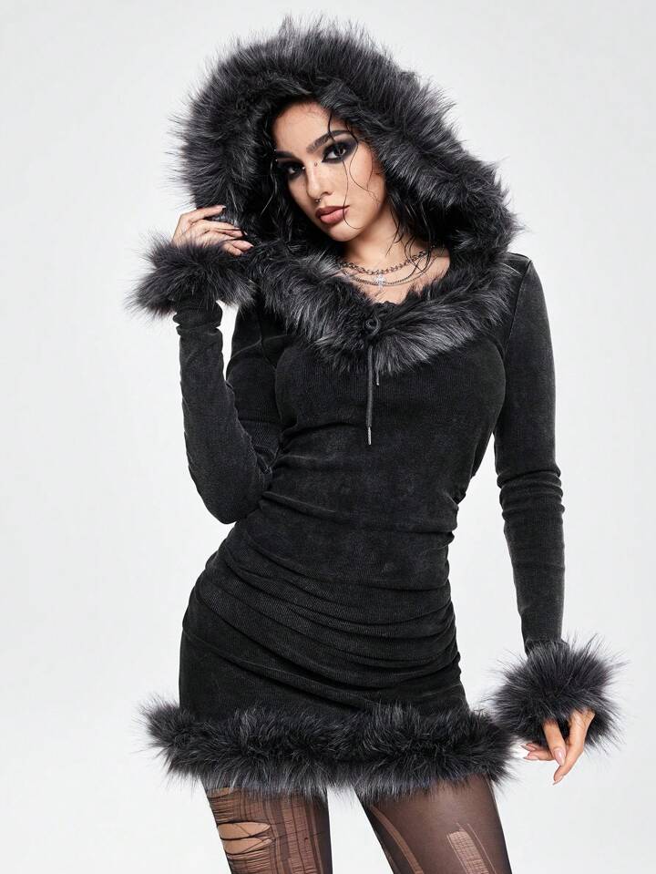 Grunge Punk Schnee-Party-Kleider, warm, thermisch, körperbetont, Langarm-Kapuzenkleid mit Mini-Länge und Schleife für Frauen, sexy, für Silvesterparty
