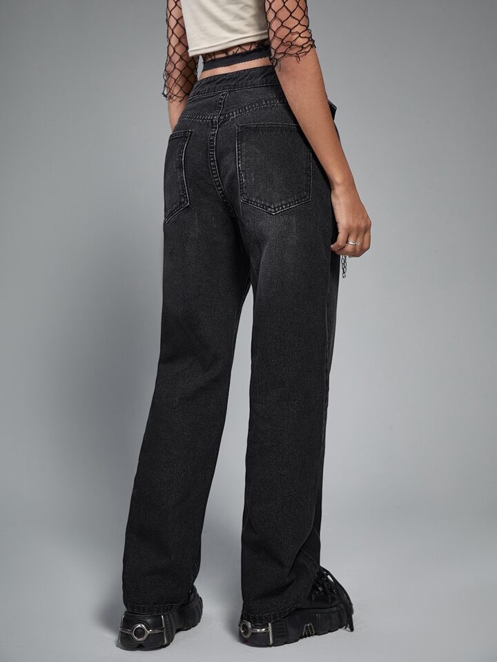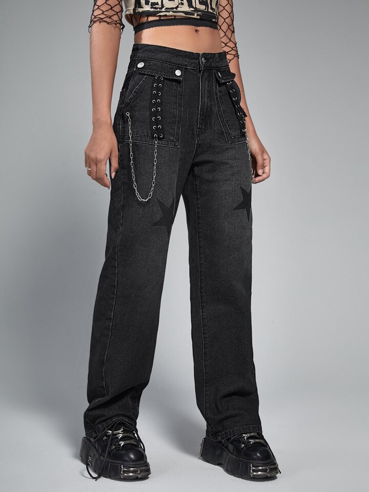 Grunge Punk Jeans mit Stern Muster, Kette Detail