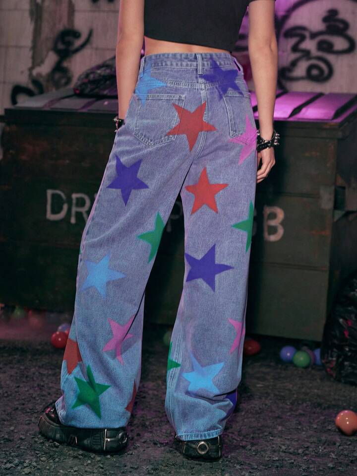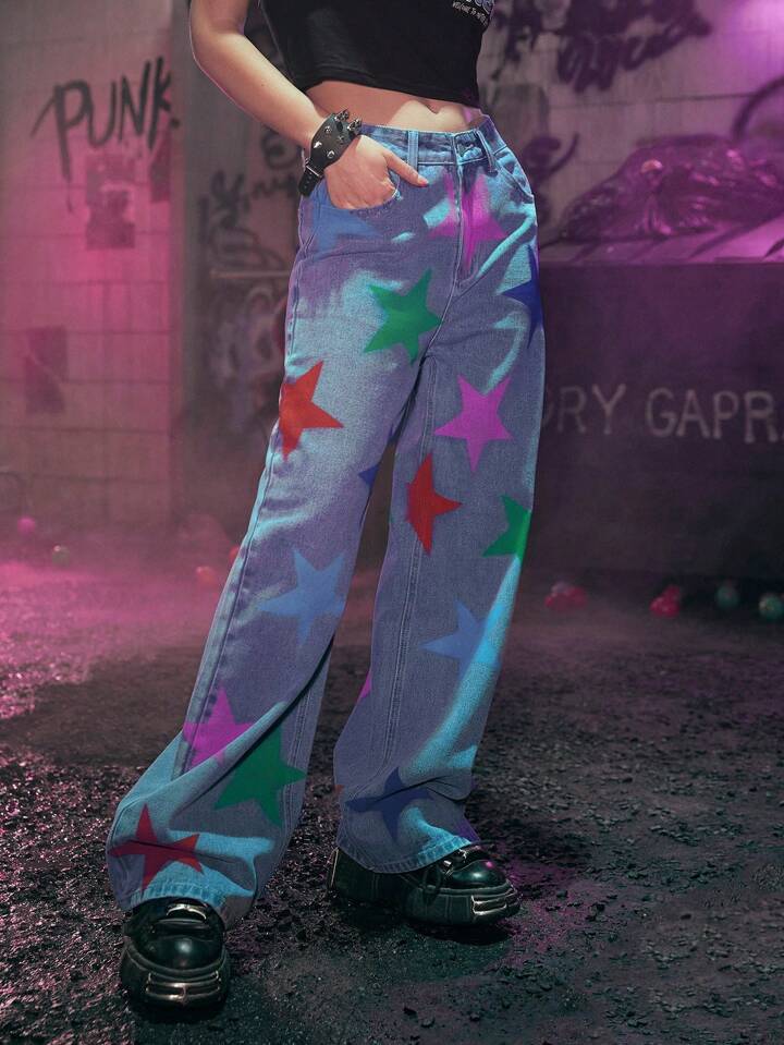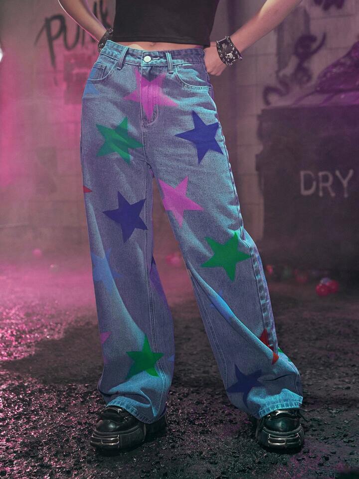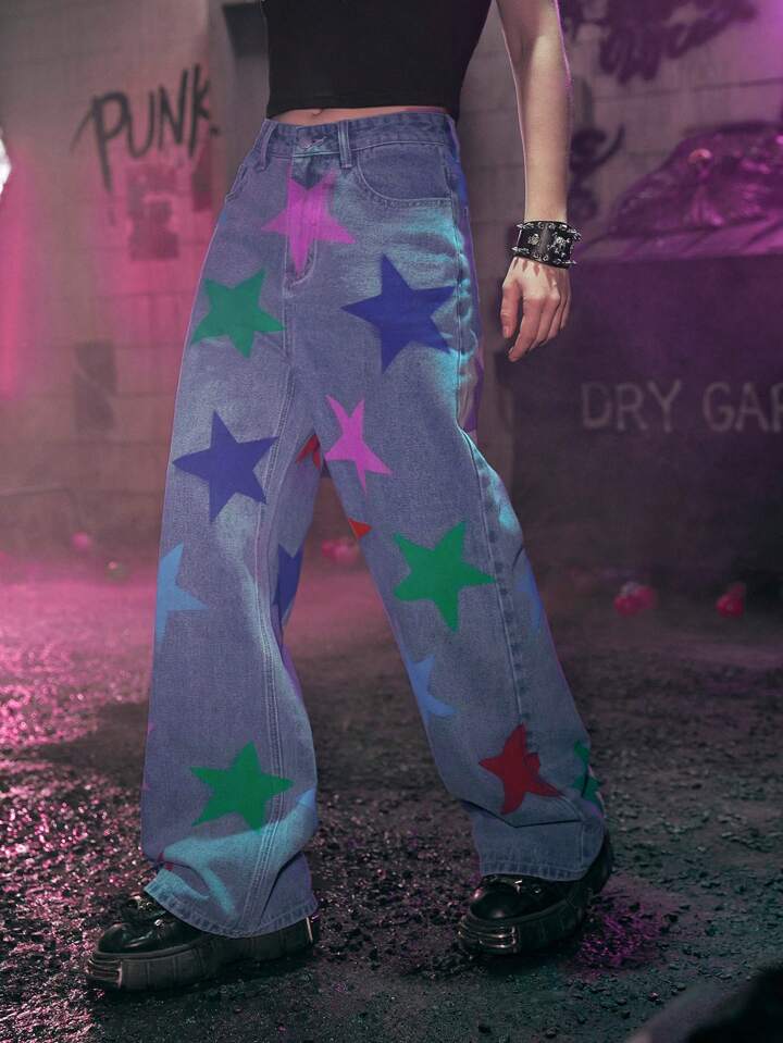 Grunge Punk Jeans mit Stern Muster, breitem Beinschnitt