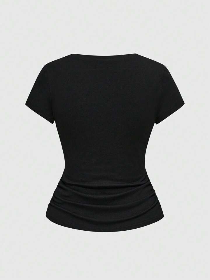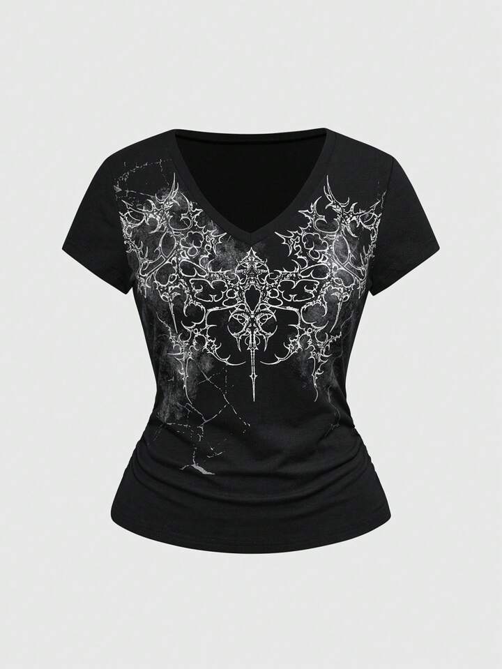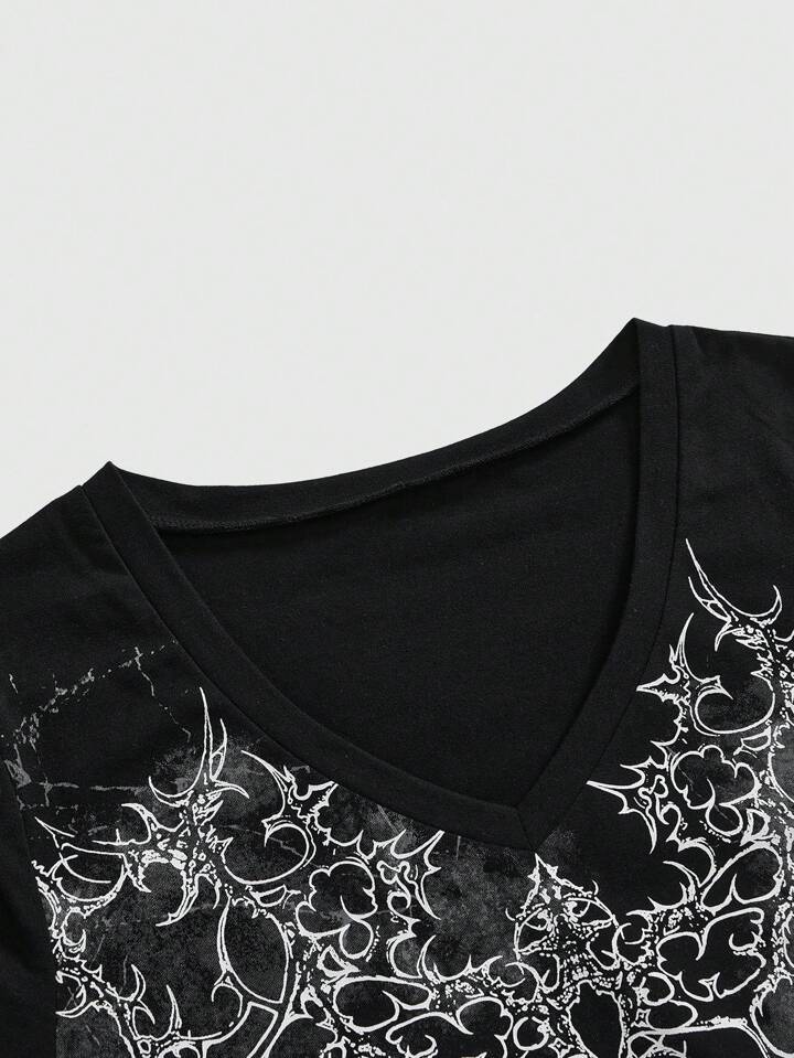 Grunge Punk Retro Streetstyle, schwarzes elastisches Grunge-Shirt mit Flügel- und Strass-Muster, V-Ausschnitt, kurze Ärmel, schmale Passform für Damen