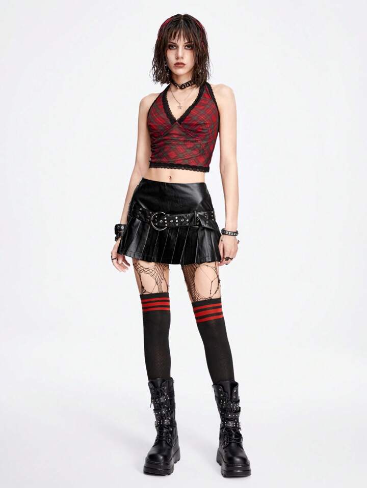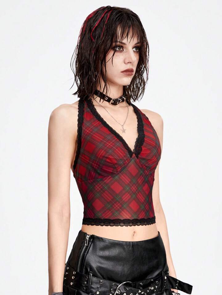 Grunge Punk Streetwear Punk Sexy Damen kariertes Spitzen-Patch-Work Schnür-Trägerhemd