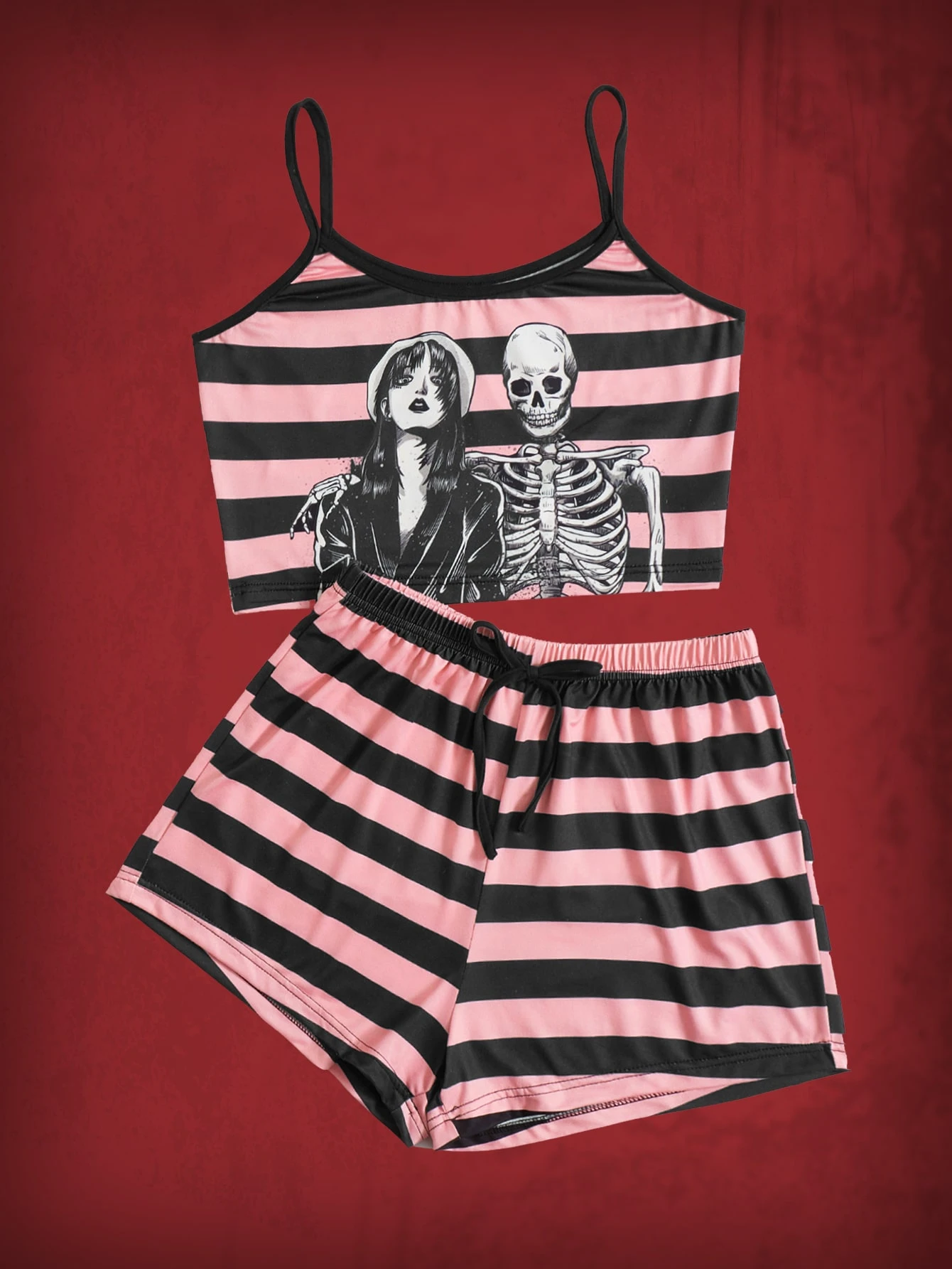 Grunge Punk Pyjama Set mit Streifen, Schädel Muster, Kontrastsaum