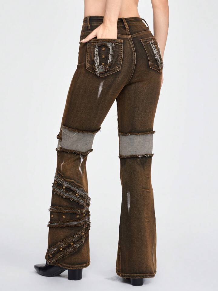 Grunge Punk Subkultur Coole Mädchen Vintage Kreuz Patch & Niet Dekor Tief Sitzende Bootcut Damen Jeans