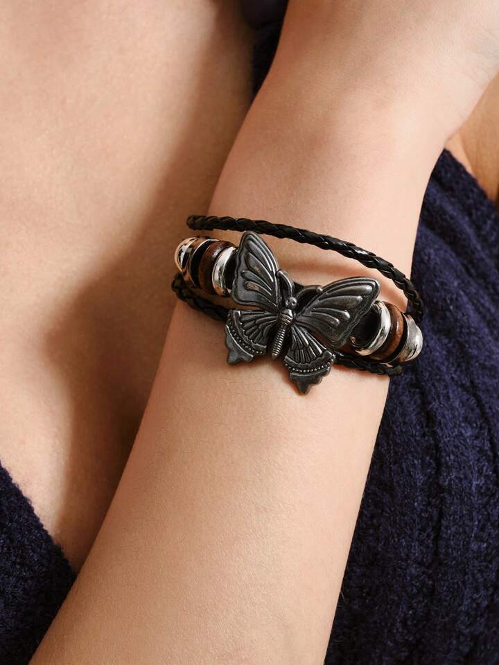 Grunge Punk Vintage Hippie Punk Stil Mehrschichtiges Schmetterling Lederarmband für Damen, ideal für tägliches Styling