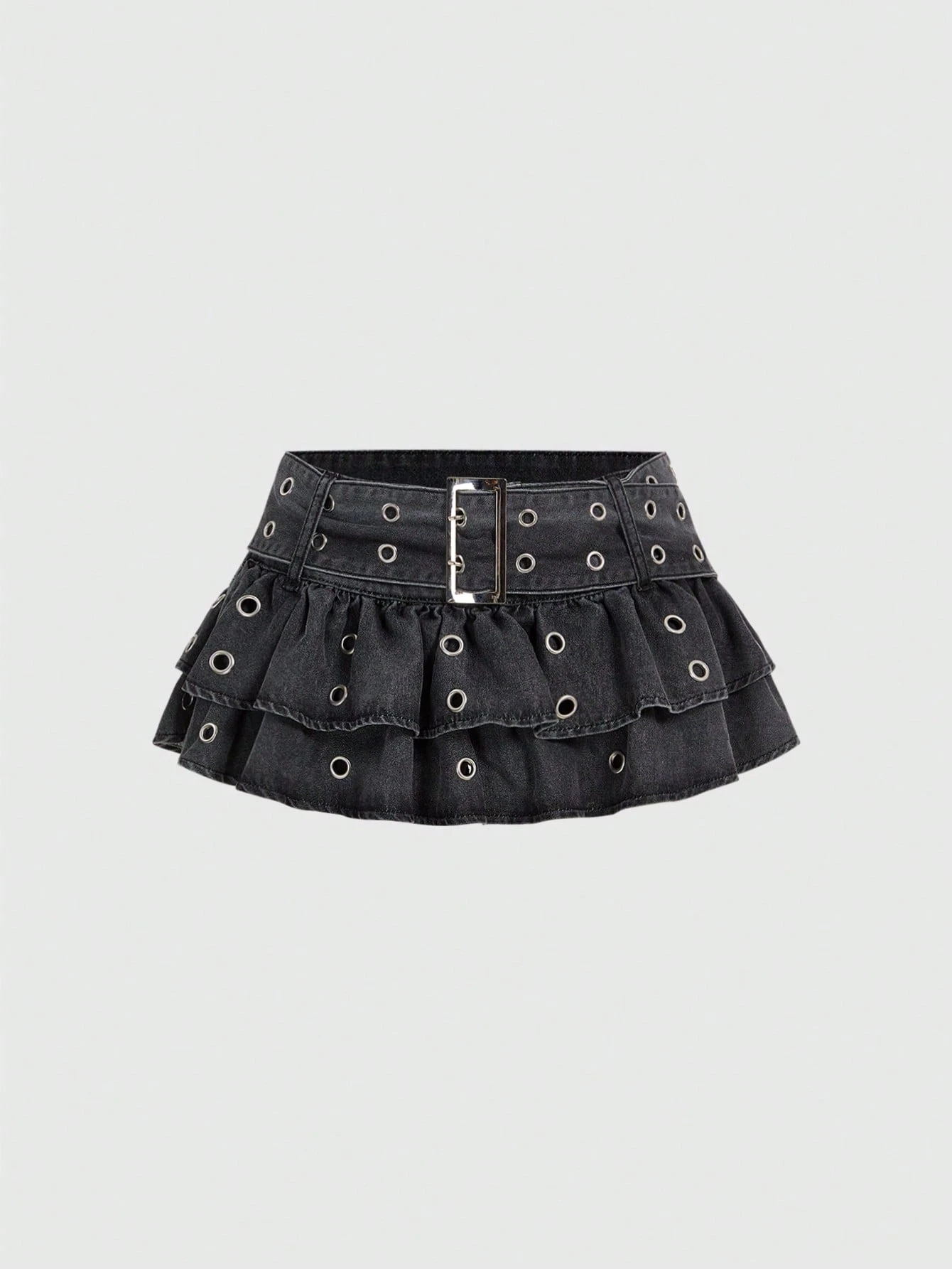 Grunge Punk Vintage Y2K Millennium Stil super tief sitzender sexy Minirock aus Denim mit doppelter Rüschenborte und Schlüsselloch