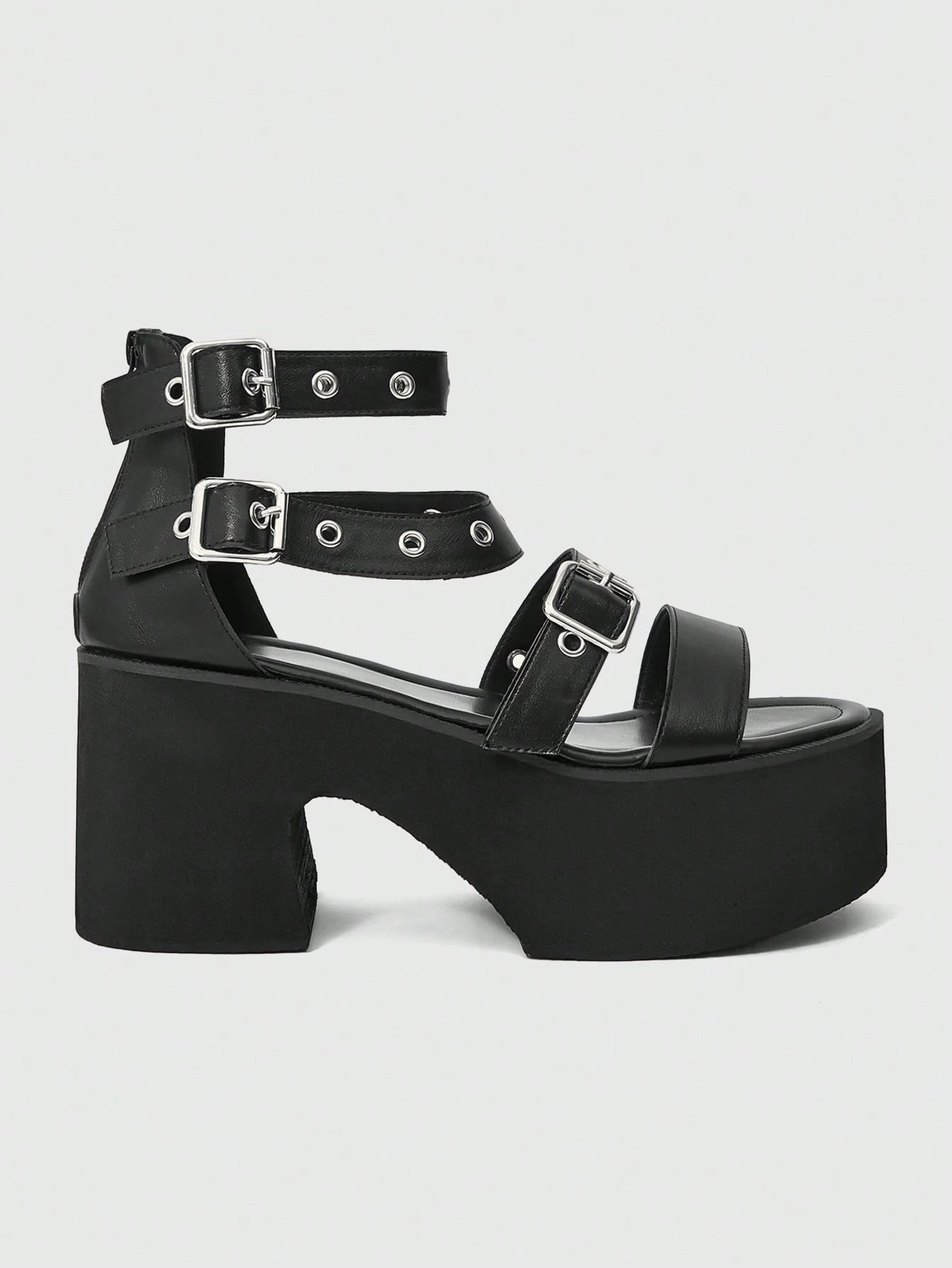 Grunge Punk Damen Punk-Stil Gürtelschnallen Knöchelriemen Plateau Keilabsatz Sandalen, PU-Leder Römerstil schwarze Sandalen geeignet für Abschluss, Fotoaufnahmen, Arbeitsplatz