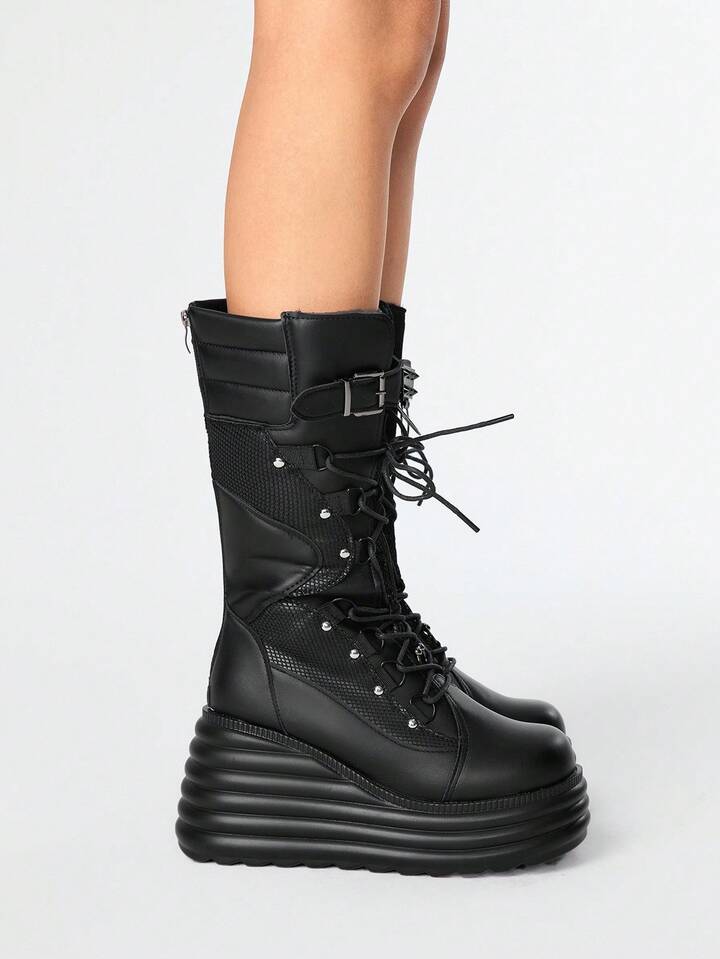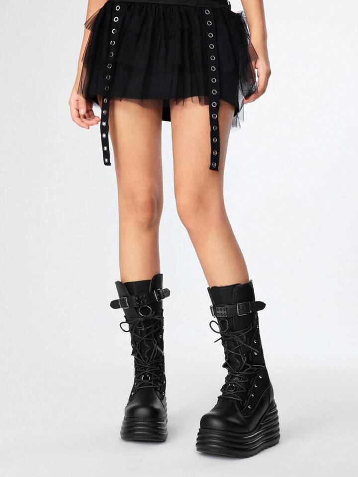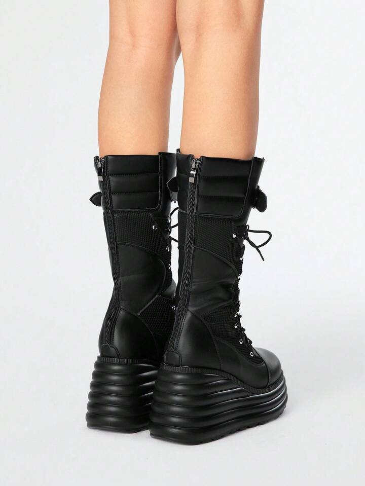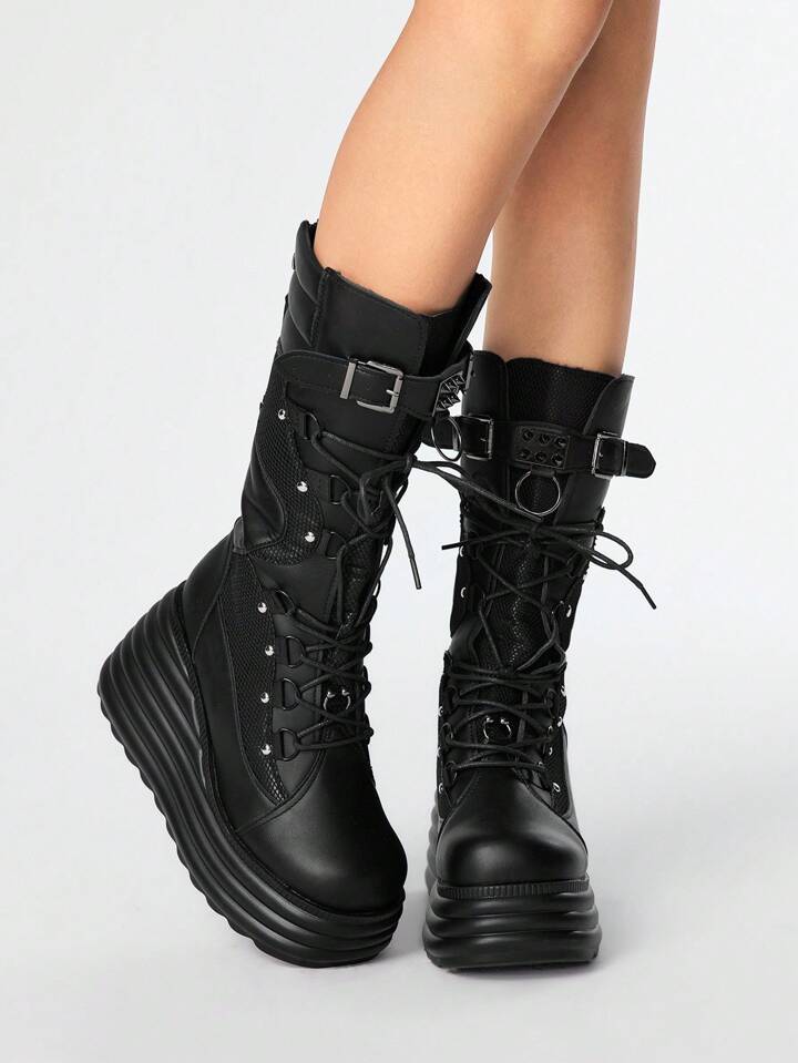 Grunge Punk Damen Schwarze Mesh-Panel Plateau Keilabsatz Stiefel Wadenlang Punk Stil Nieten Goth Dunkel Lässig Schuhe, Halloween