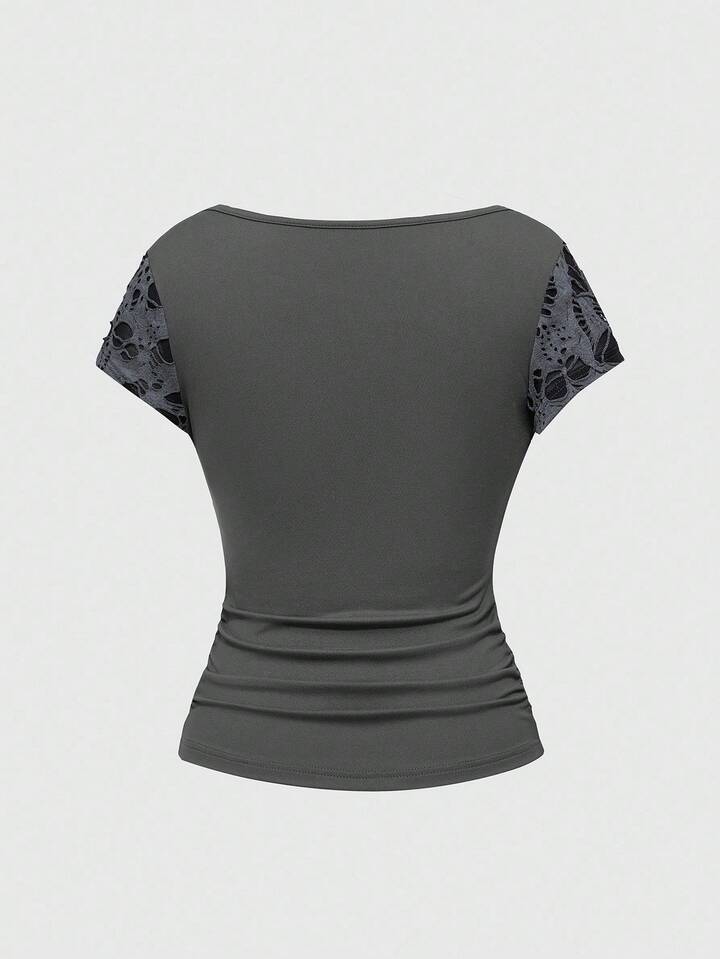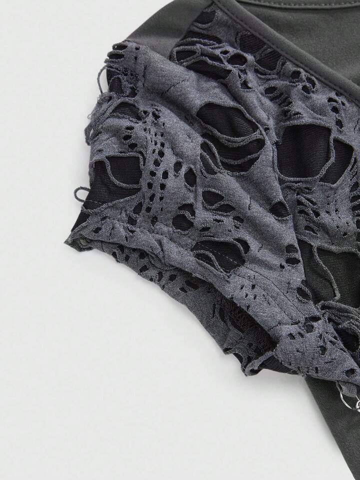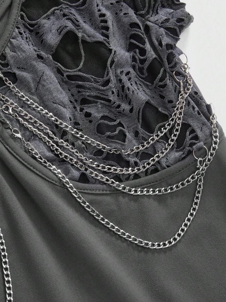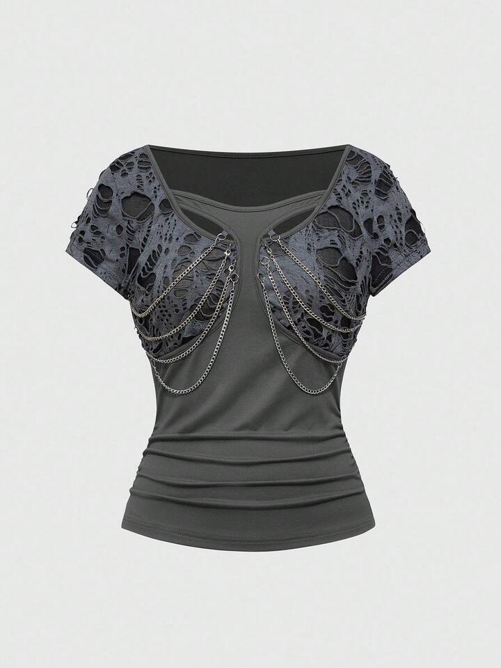 Grunge Punk Damen Schwarzes Punk Ketten Plissee Design T-Shirt